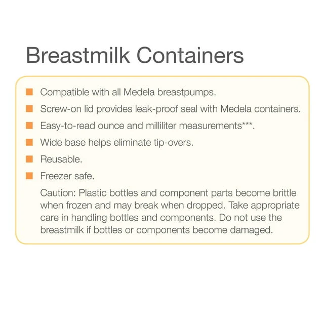 - Compatible with Medela breast pumps for pumping directly into the container (not recommended for use with the Single Deluxe breast pump)