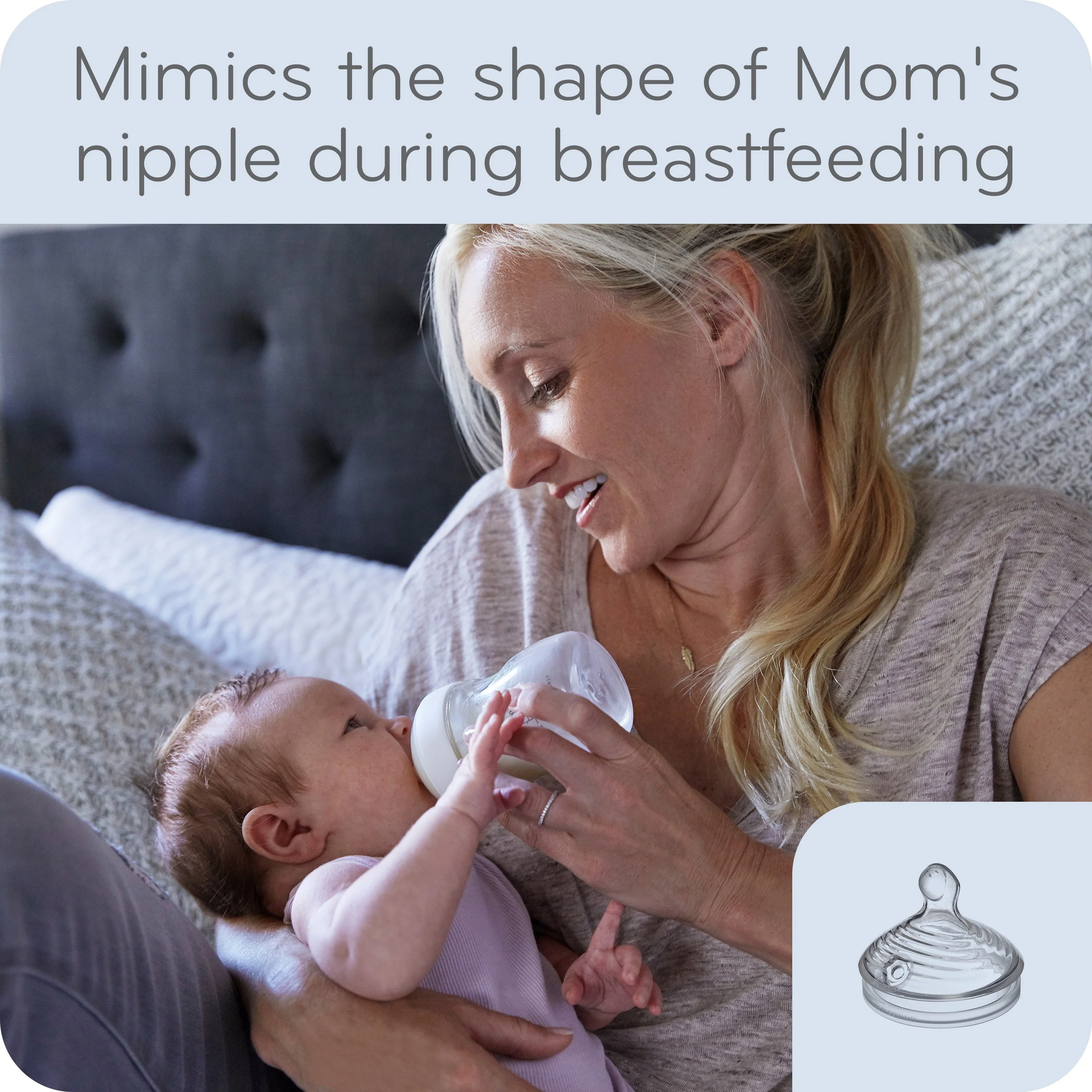 - Flexible nipple allows for a continuous latch and is the same shape as mom’s nursing nipple during breastfeeding
