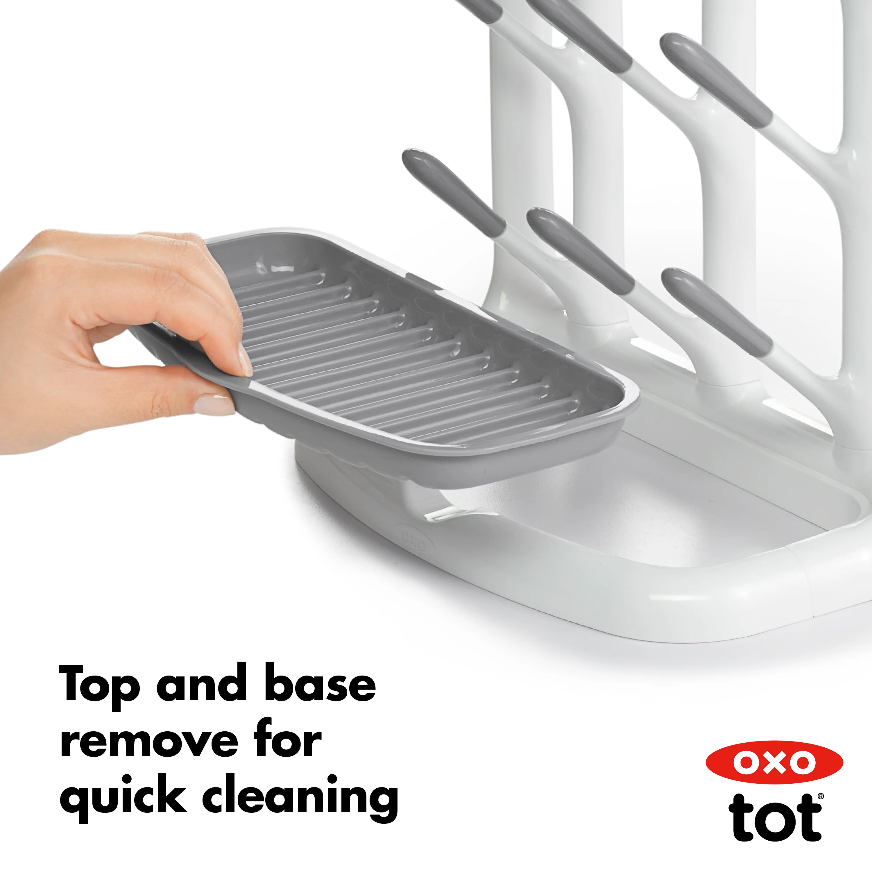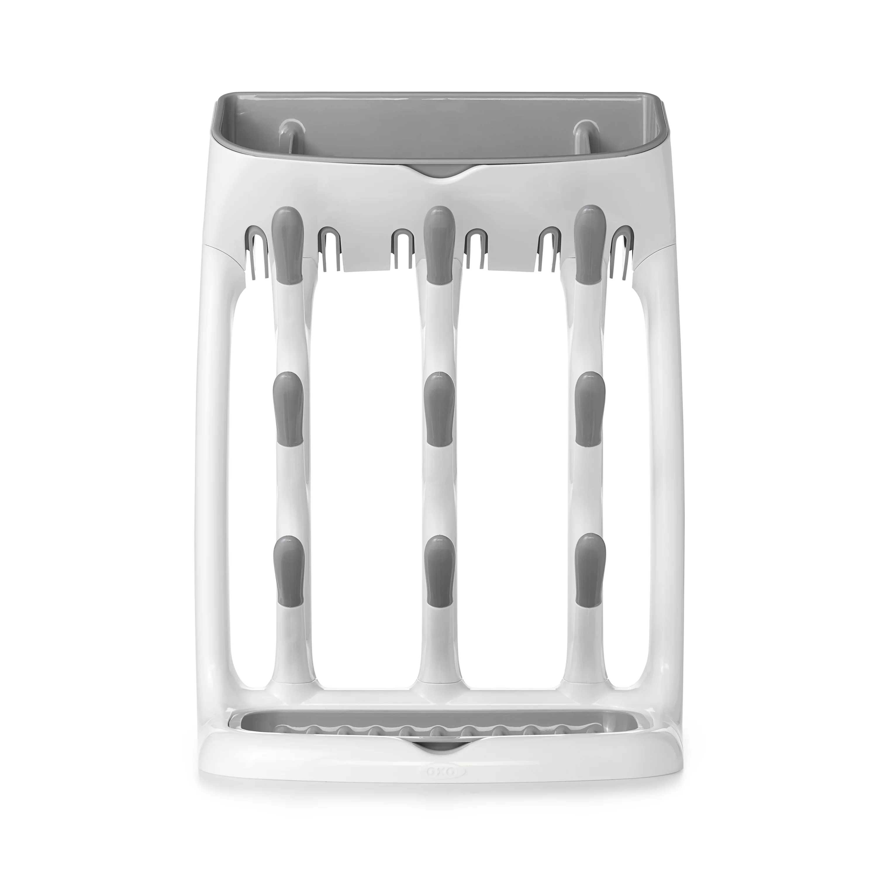 Use the OXO Tot Space Saving Drying Rack to dry baby bottles and sippy cups without taking up too much space. Compact design features 9 angled hooks for bottles and cups plus a removable top compartment for covers, nipples, and other small items.