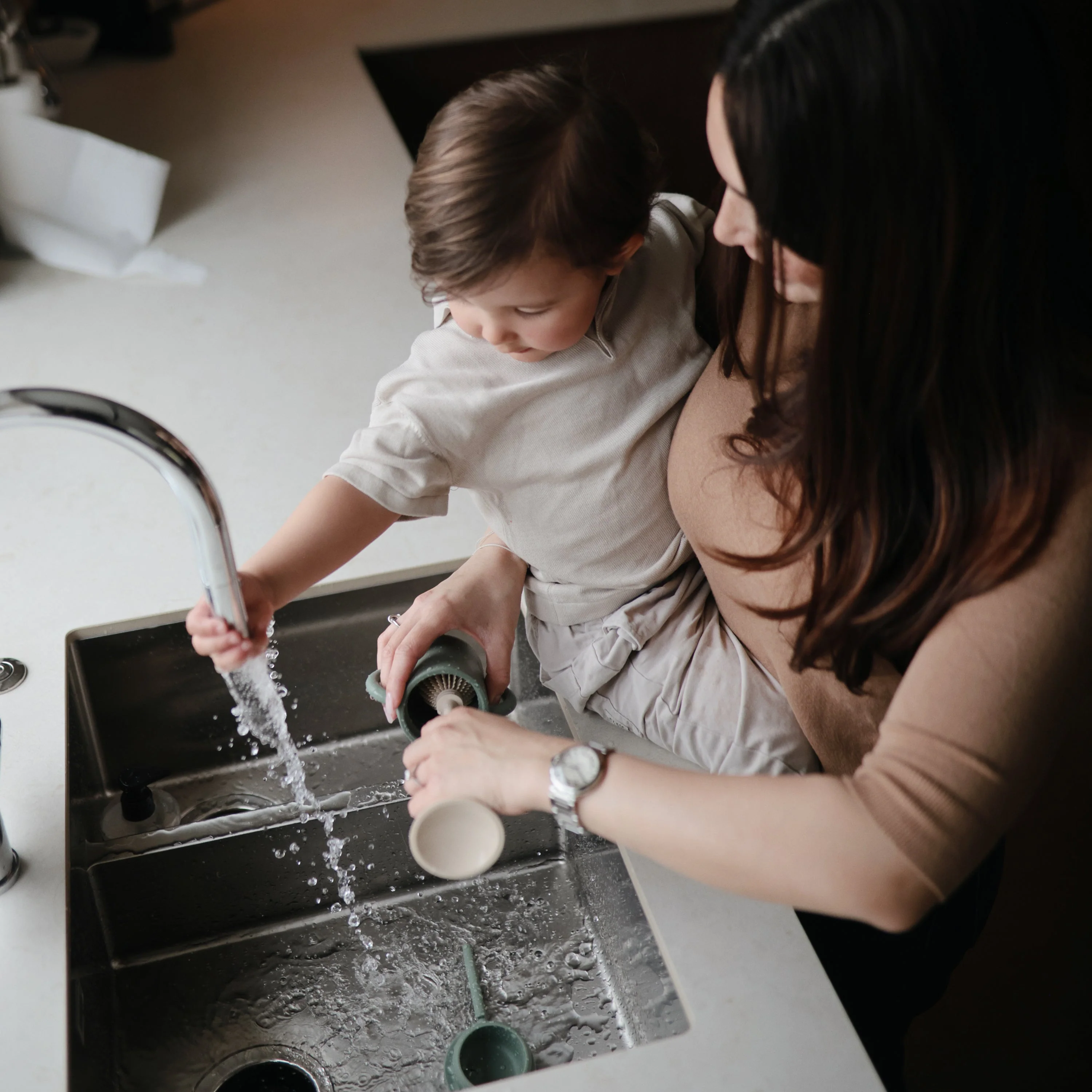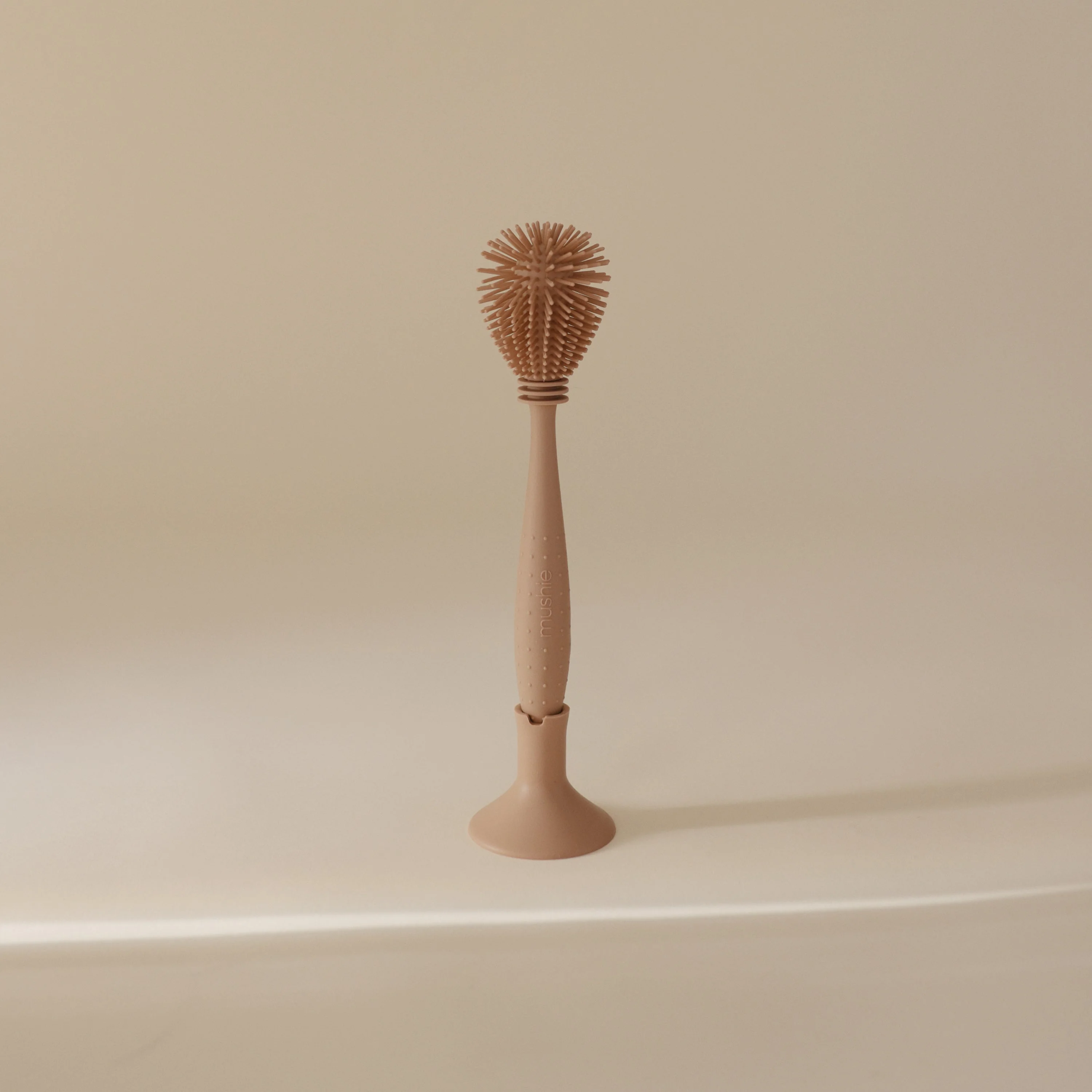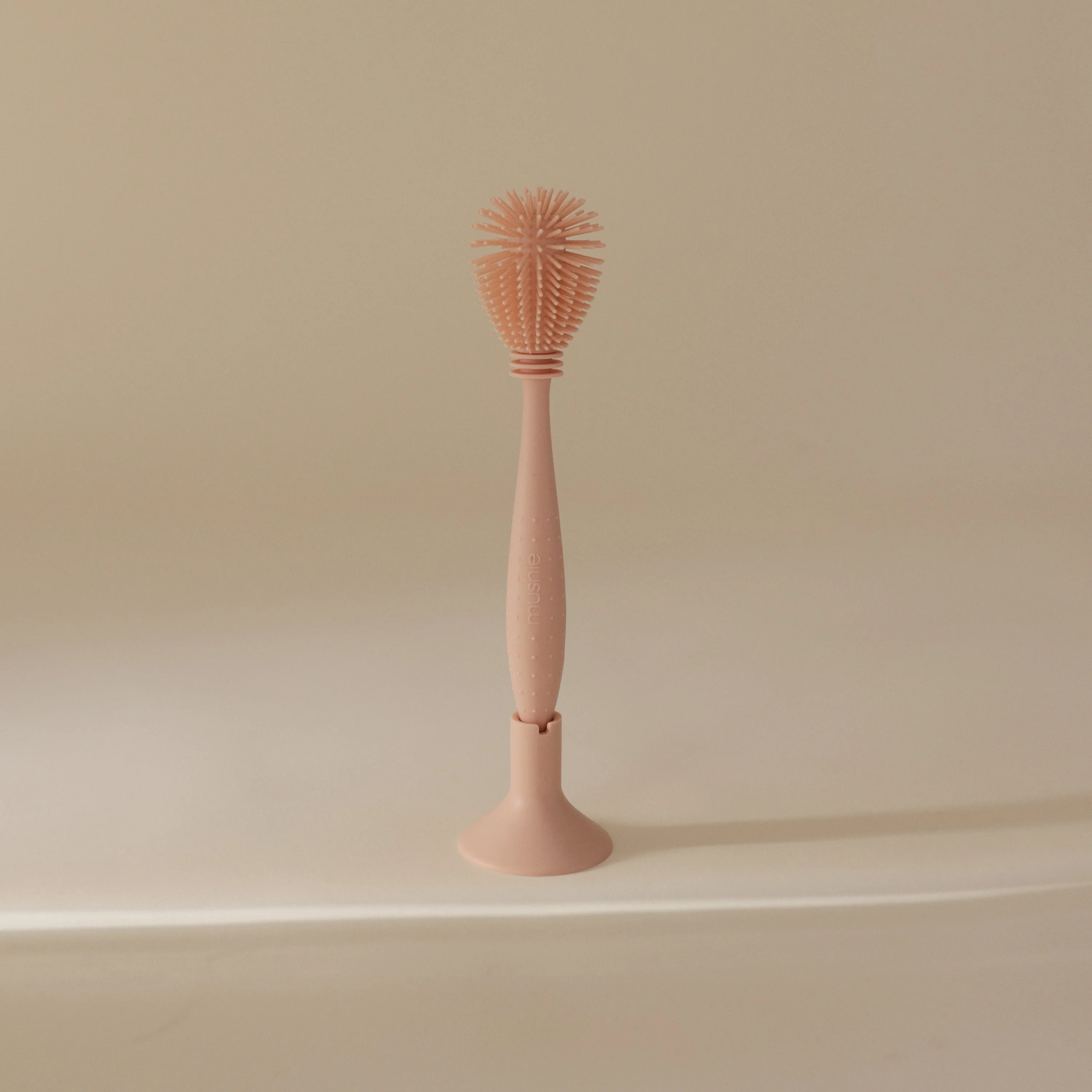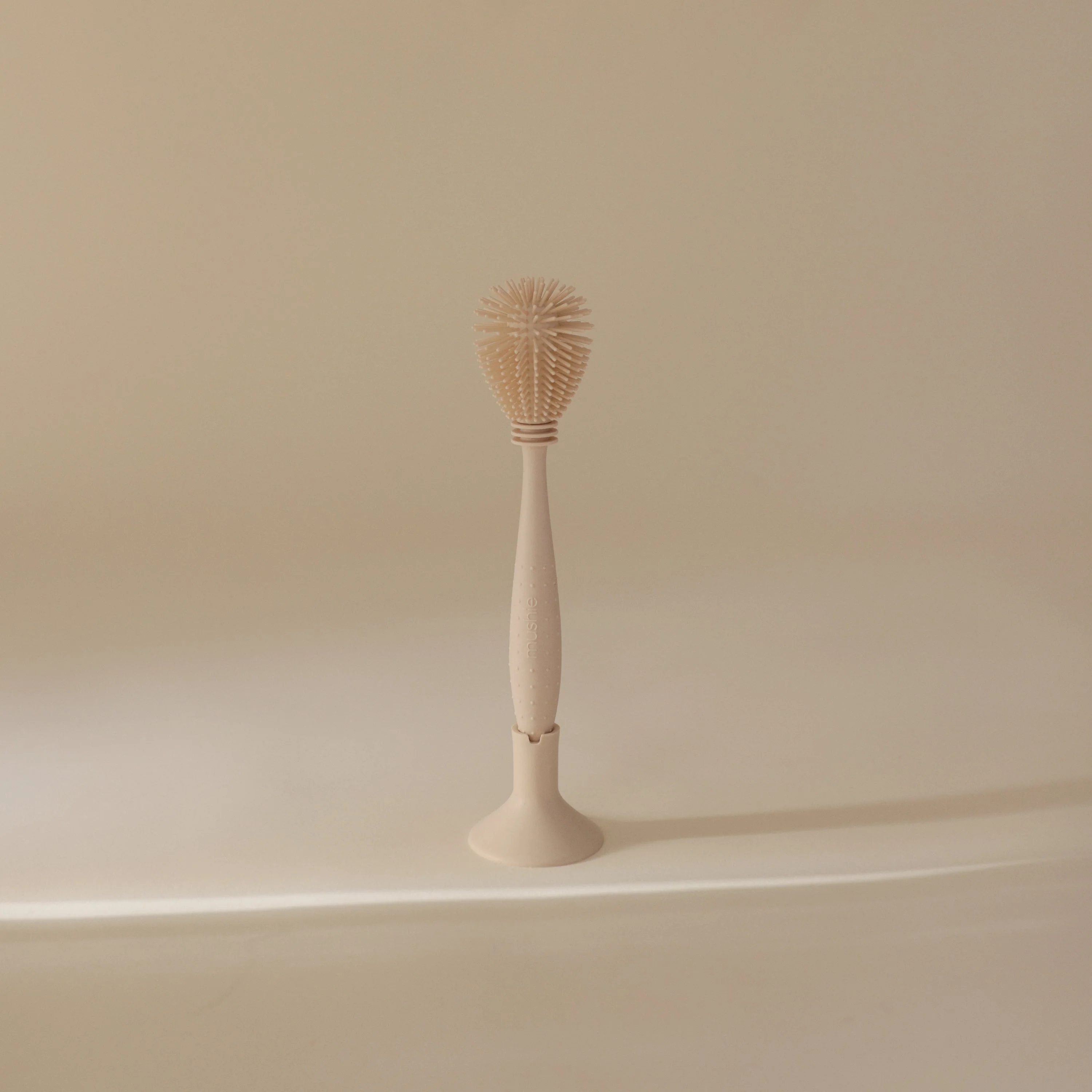 Our double-sided baby bottle brush is a perfect 2-in-1 solution for maintaining your little one's feeding essentials. One side features a larger removable brush head with durable non-scratch silicone bristles, designed to effortlessly clean the inside of baby bottles. The other side features a smaller brush head for precision cleaning bottle nipples and tight spaces. The smaller end conveniently stores inside the suction base to minimize kitchen clutter and keep your brush at arm’s reach. An ergonomic textured handle provides a comfortable grip for thorough cleaning. Parents can easily sterilize the entire brush to help keep baby’s feeding products safe and healthy throughout their feeding journey. The versatile sized brush heads are also great for cleaning water bottles and sippy cups as your little one grows.