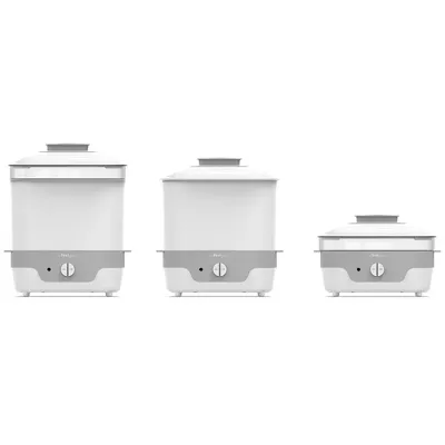 Use either tray or both at the same time. The clever design of the bottom tray directs steam deep inside bottles while both trays fully circulate the steam to make sure every surface is covered.