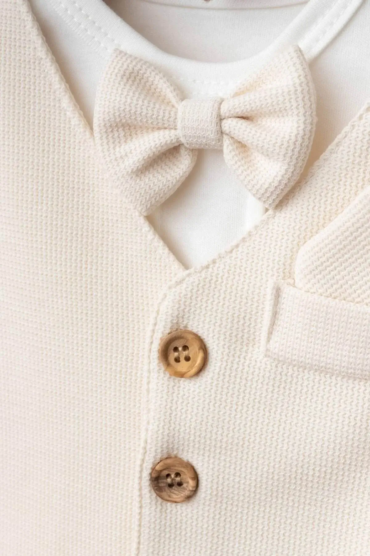 Jumpsuit and Vest Combination: The top piece consists of a white jumpsuit with long sleeves and a cream colored vest over it. This combination creates a smart look and gives the baby a formal style.