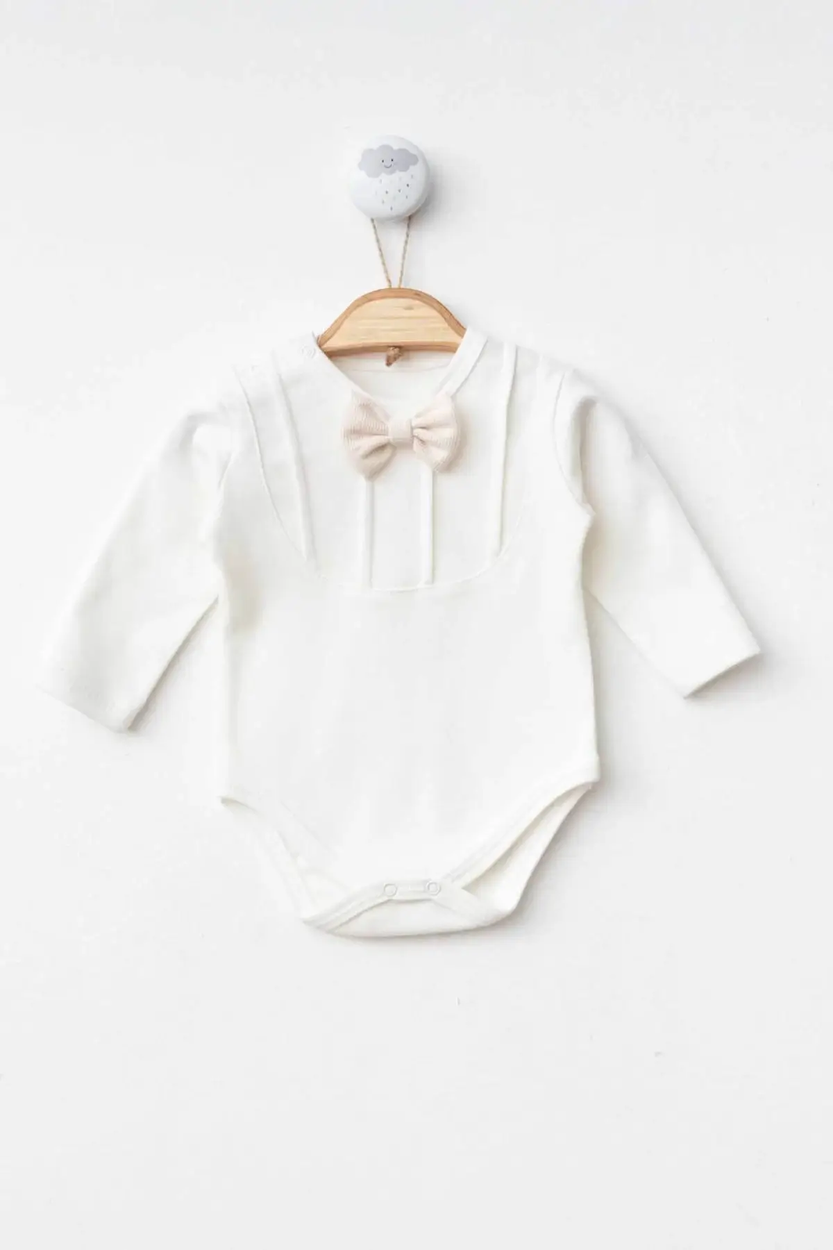 Pants: The bottom piece is a pair of cream-colored trousers made of soft fabric. The trousers have an elasticated waistband and are designed for easy on and off for baby.