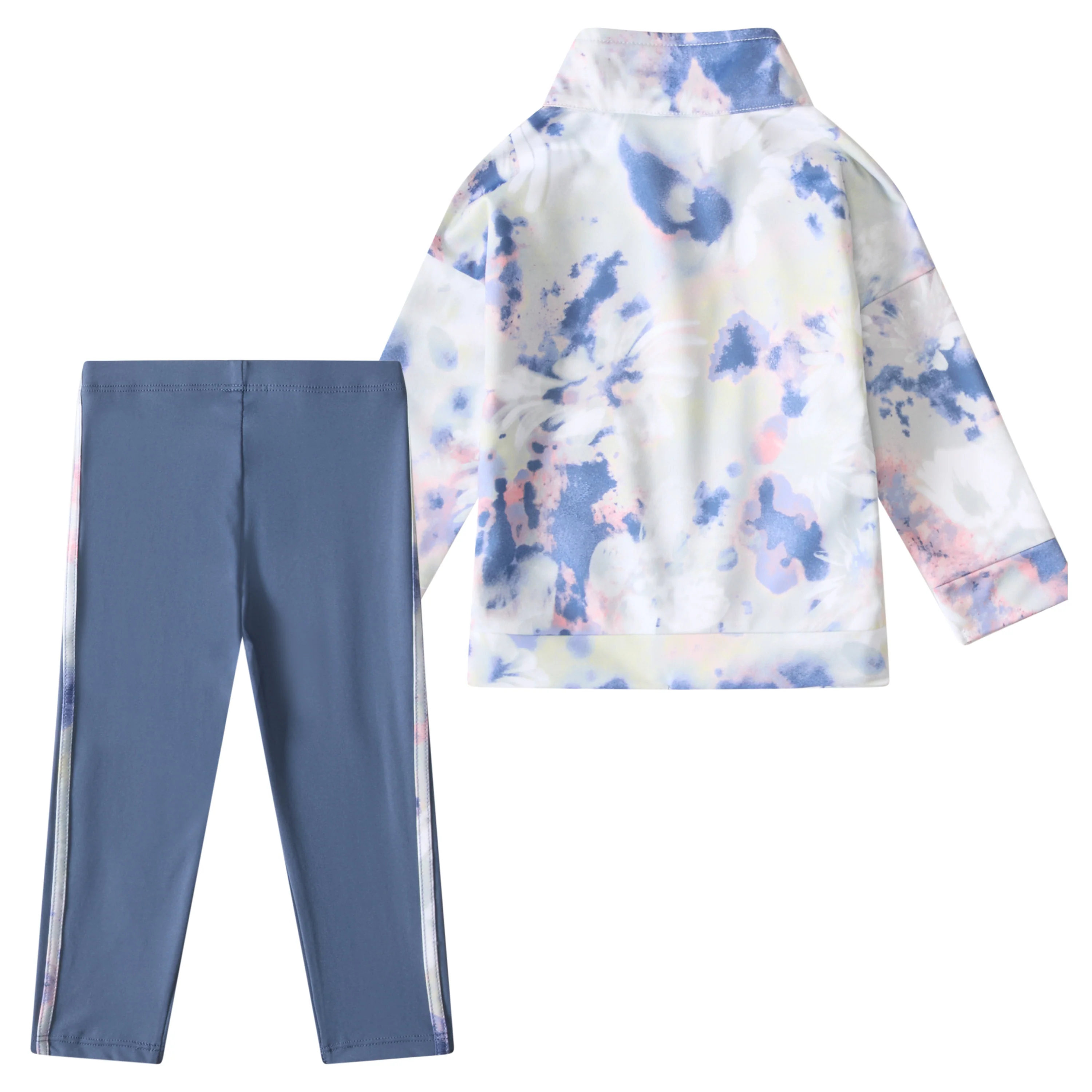 The AOP Tricot Jacket Legging Set features full-zip front jacket with all-over seasonal print, mock neck, drop shoulder, and princess seams with on-seam pockets. Embroidered adidas Sportswear Logo on left chest. Coordinating legging features elastic waistband and printed applied 3-Stripes down side seams. adidas Sportswear Logo heat transfer on left hip. Floral Wash blue print jacket and stripes.