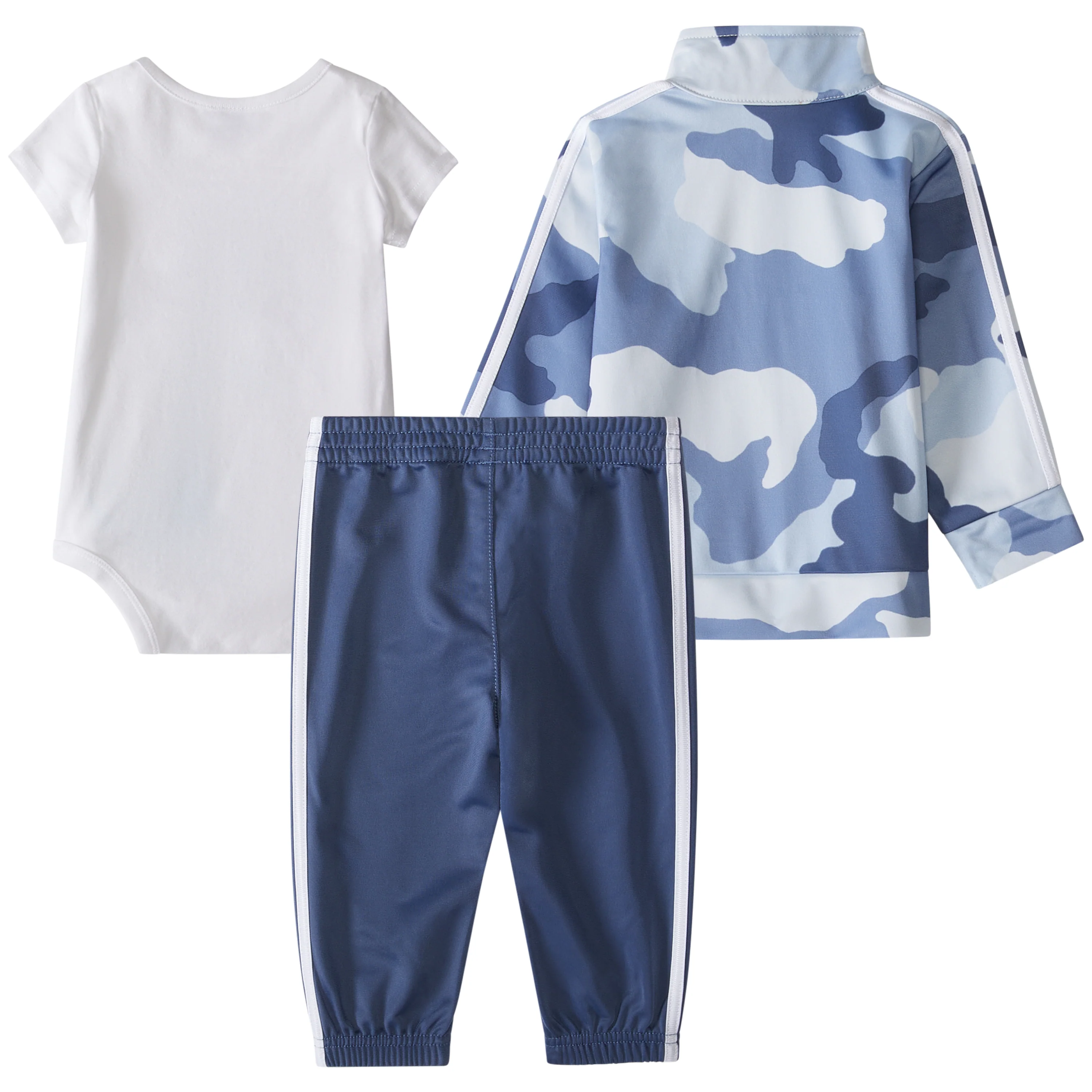 The 3PC AOP Tricot Track Set features zip front jacket with mock neck, welt pockets, and all-over seasonal France Camo print. Applied 3-Stripes down sleeves and embroidered adidas Sportswear Logo on left chest. Bodyshirt features lapped shoulder, snap crotch closure, and large adidas Sportswear Logo screenprint on center front. Jogger features elastic waistband, applied 3-Stripes down side seams, and elastic hem. Embroidered adidas Sportswear Logo on left hip.