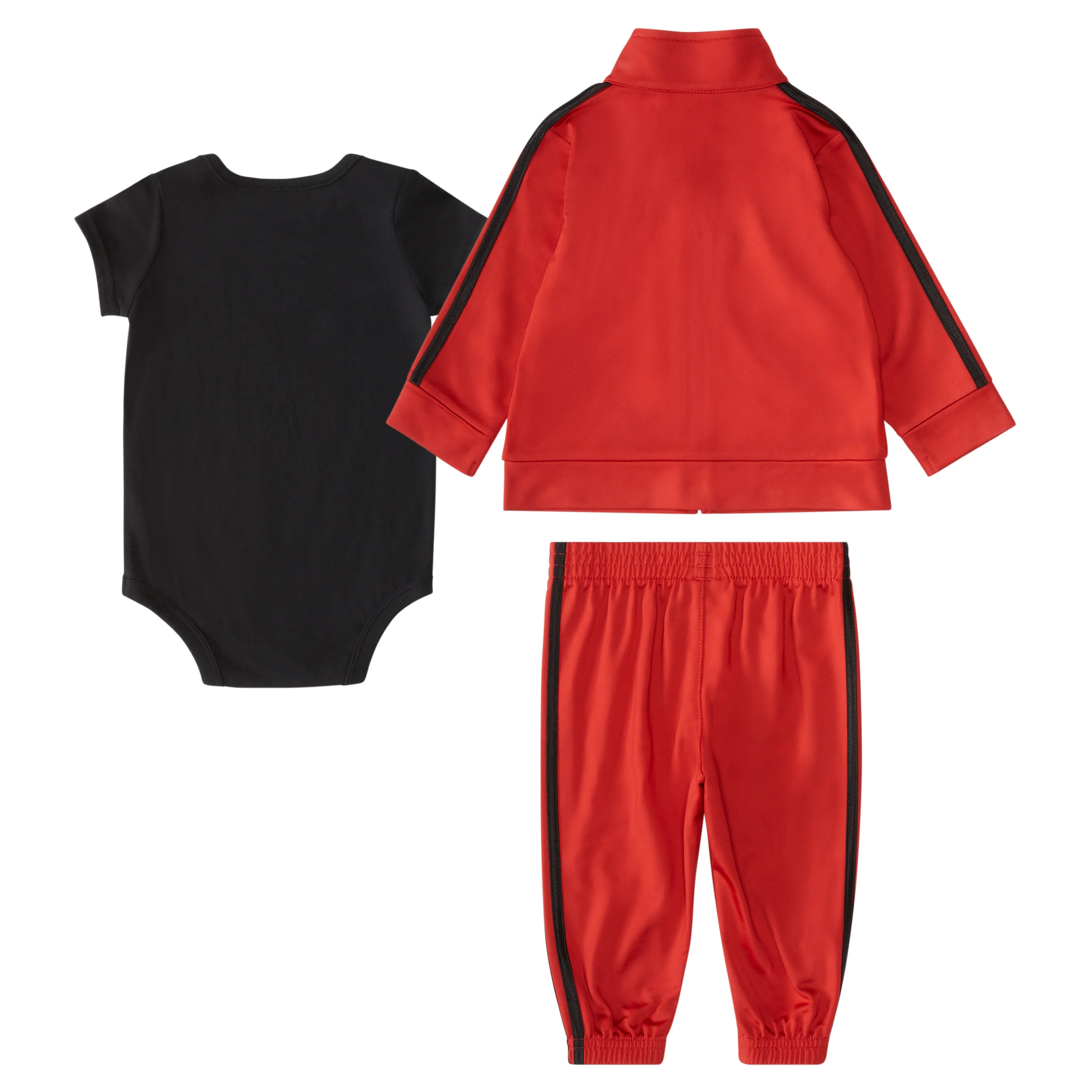 - This three-piece adidas set for babies includes jogger-style pants and a zip-up jacket. It also comes with a short sleeve body shirt with lapped shoulders and a snap crotch for easy changing.