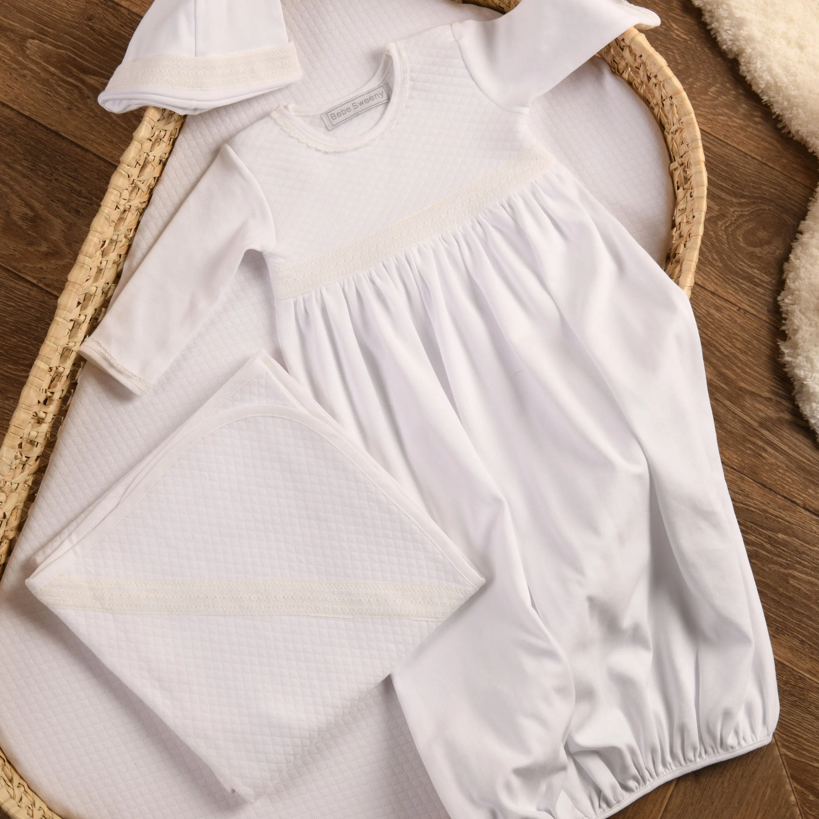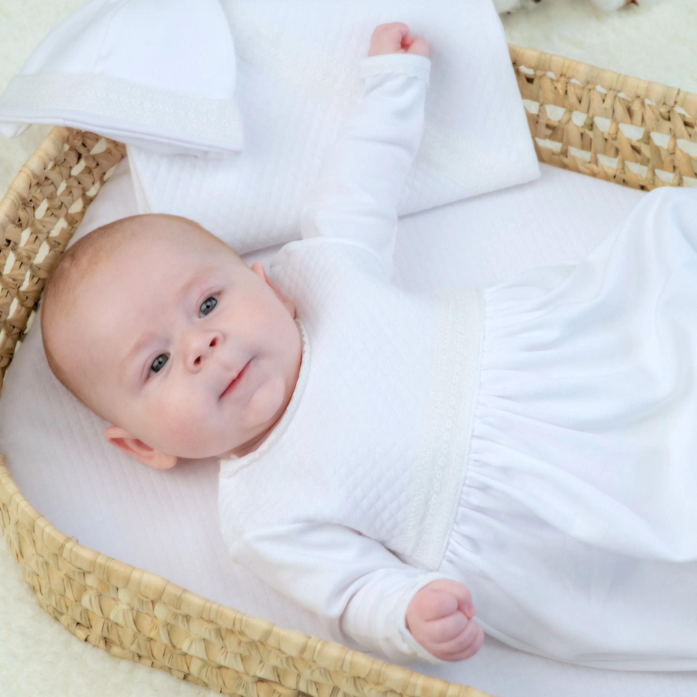 A lovely white ceremony gown for baby made in soft cotton. The ivory lace accent adds a subtle special detail and the quilted cotton in a lovely shade of white is as stylish as comfortable. This baby gown is functional with an elasticated hem and keeps baby covered while also allowing easy diaper changes. The matching white blanket and hat are also available to complete this outfit that is as sweet as he is. It also makes a perfect bris outfit.