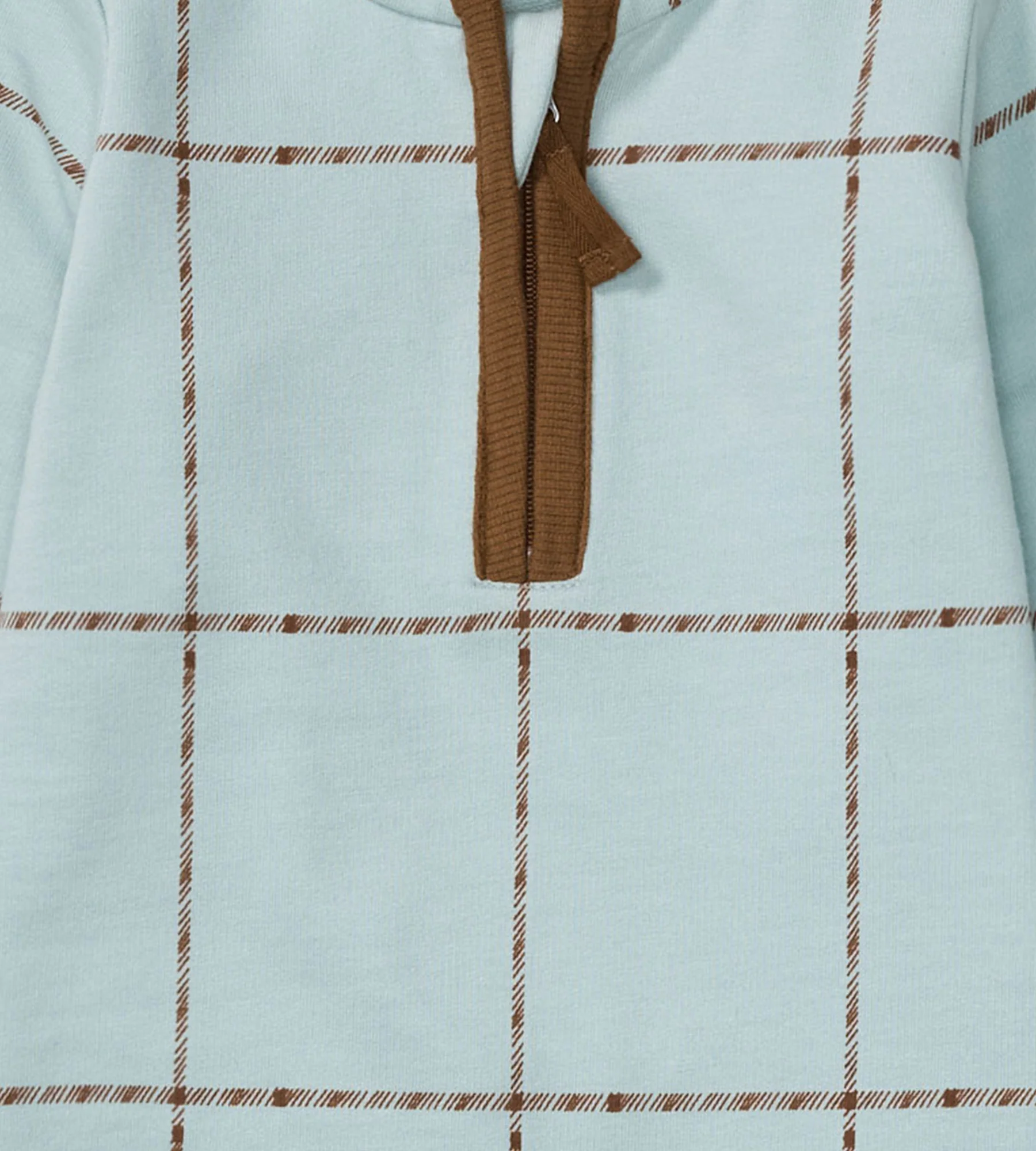 Your little bee will be ready for Fall days in our quarter zip window plaid jumpsuit!