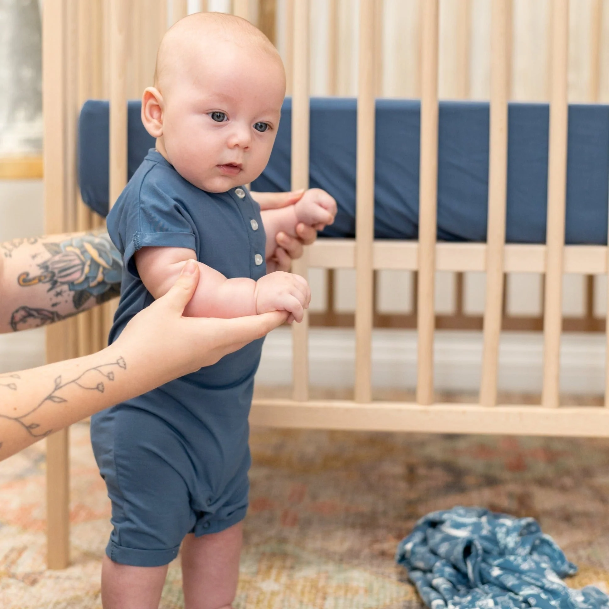 This hip one-piece romper is style like a t-shirt and looks oh so handsome on those hot summer days.