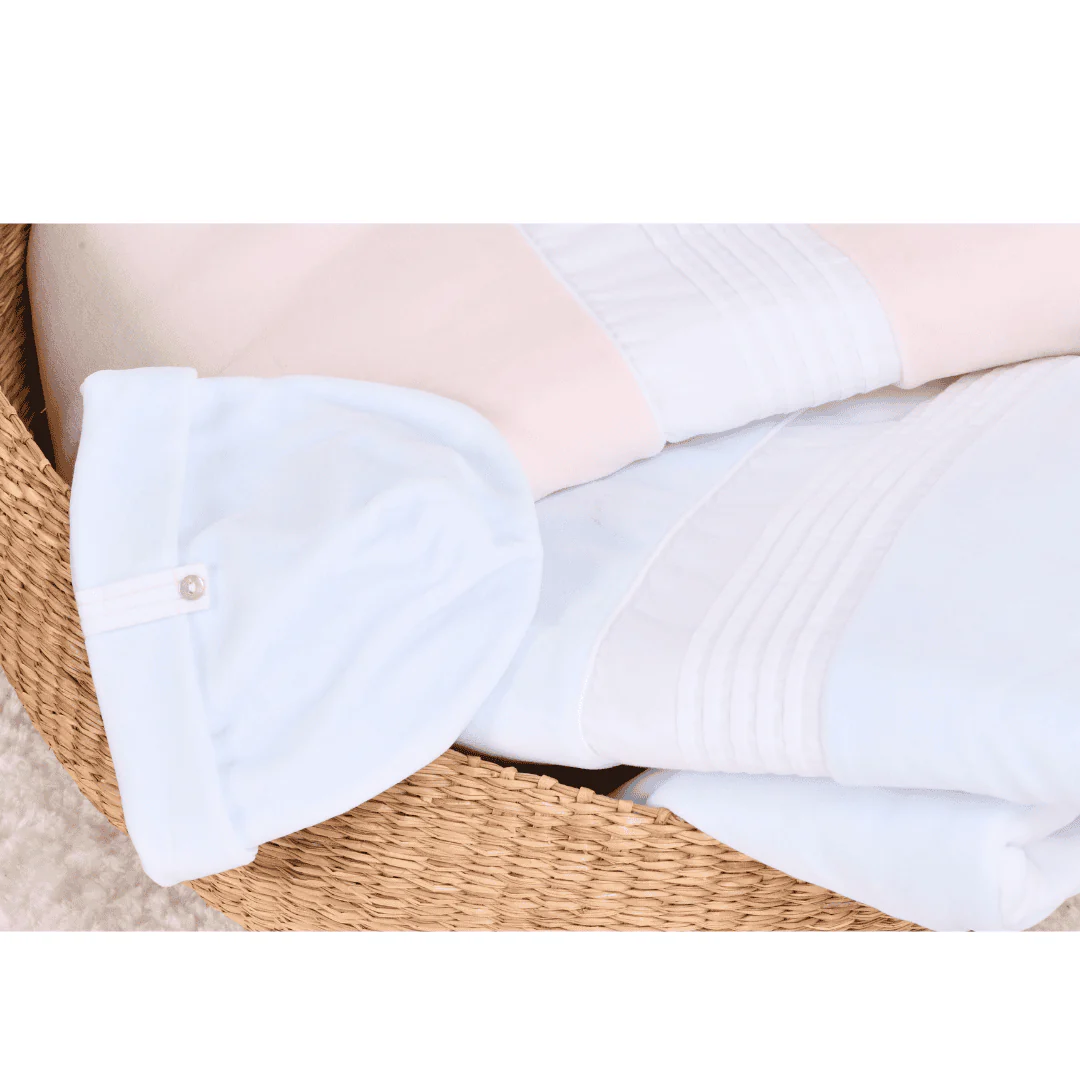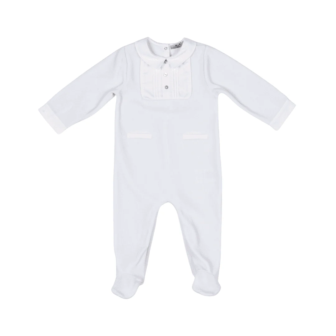 - The babygrow has a white pleated detail on the front and a shirt collar.