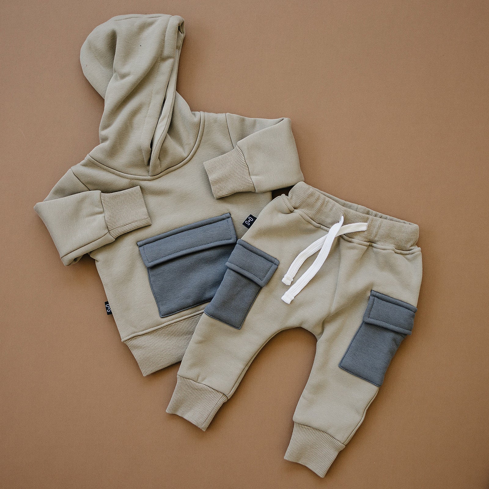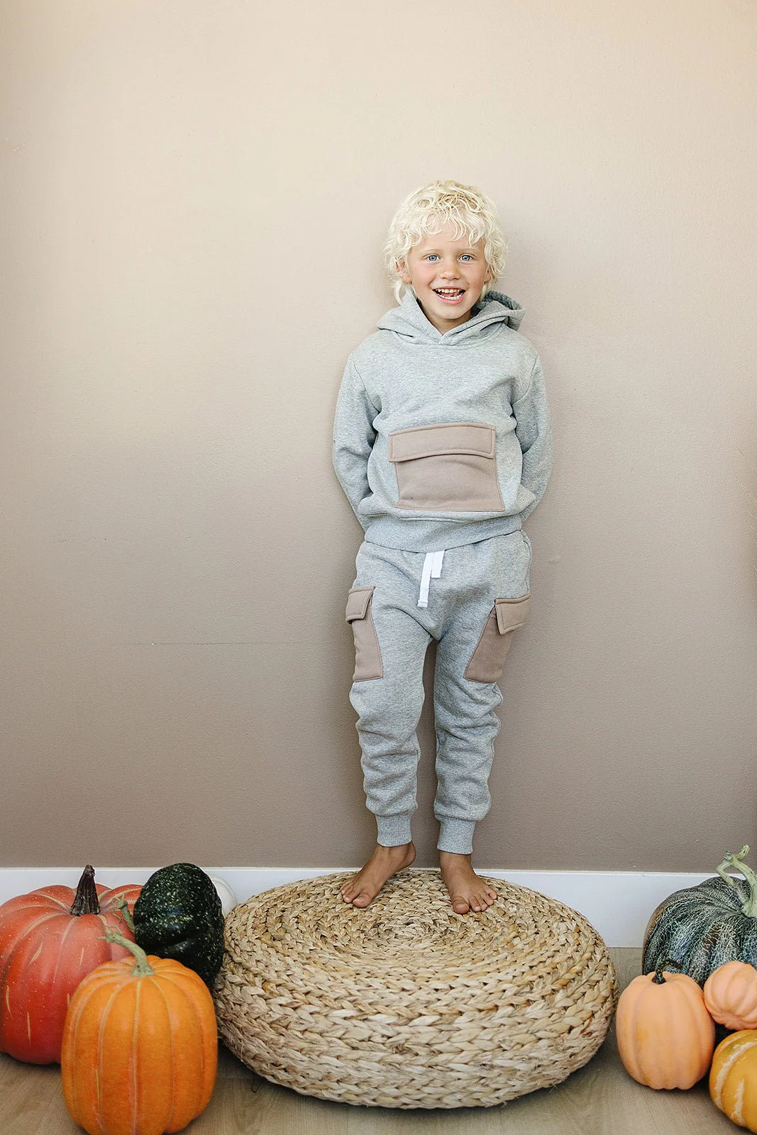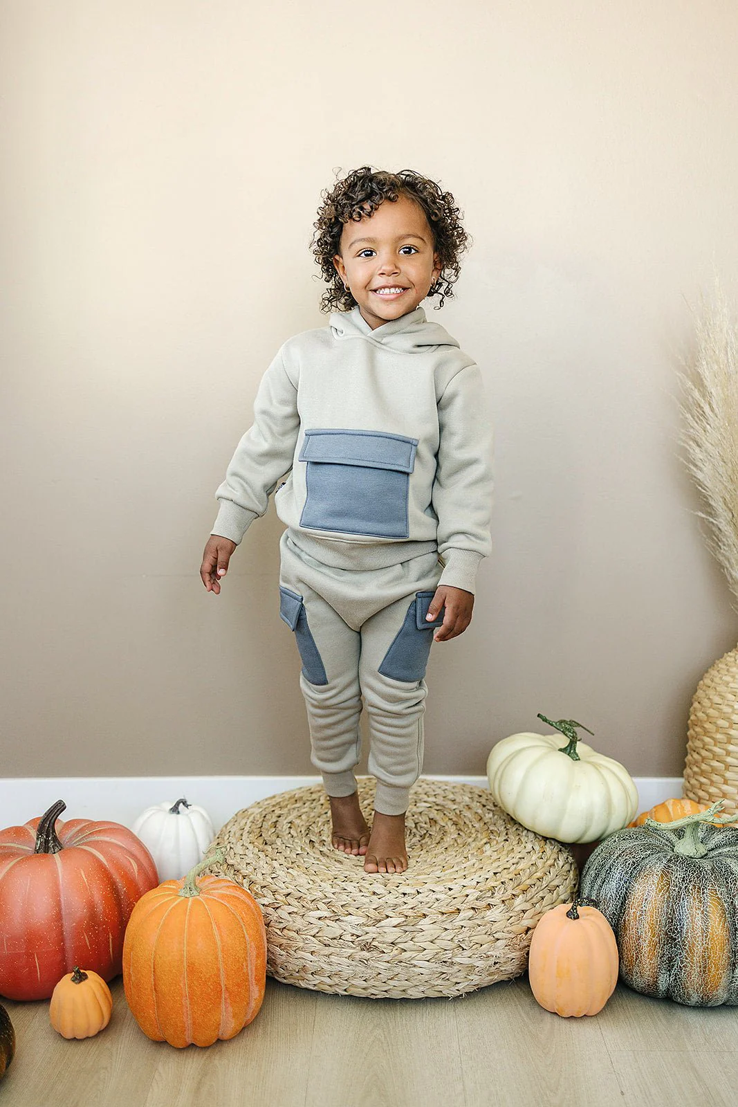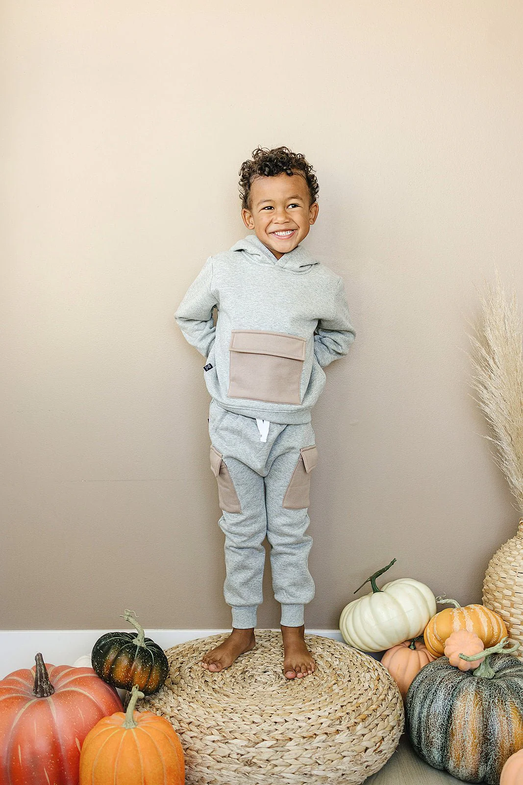 Stay cozy and stylish with our Collins Jogger Set. This super warm set is perfect for any occasion and features contrasting cargo pockets for added style. The elastic waistband and drawstring guarantee a perfect fit every time. Available in subtle neutral colors your little one will love.