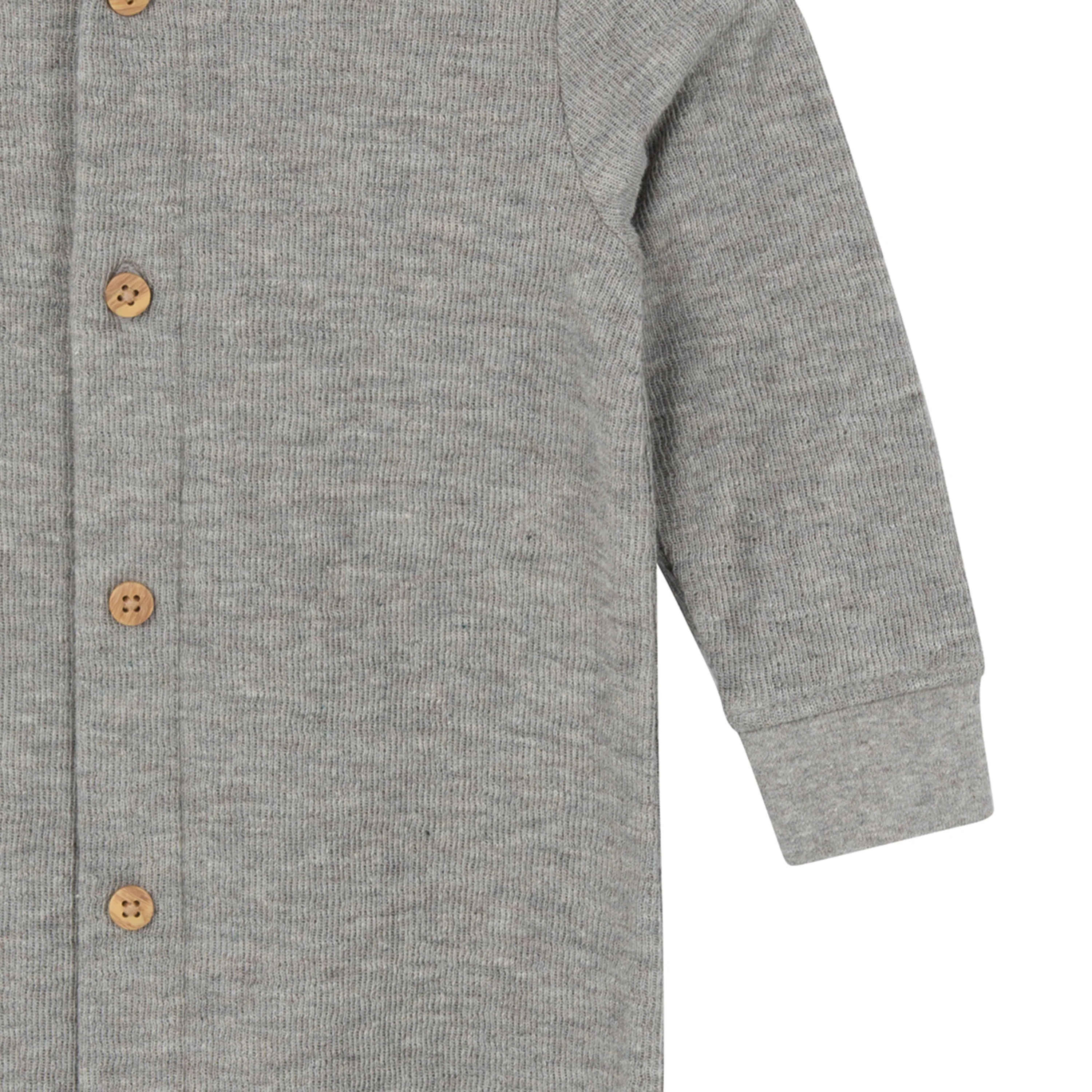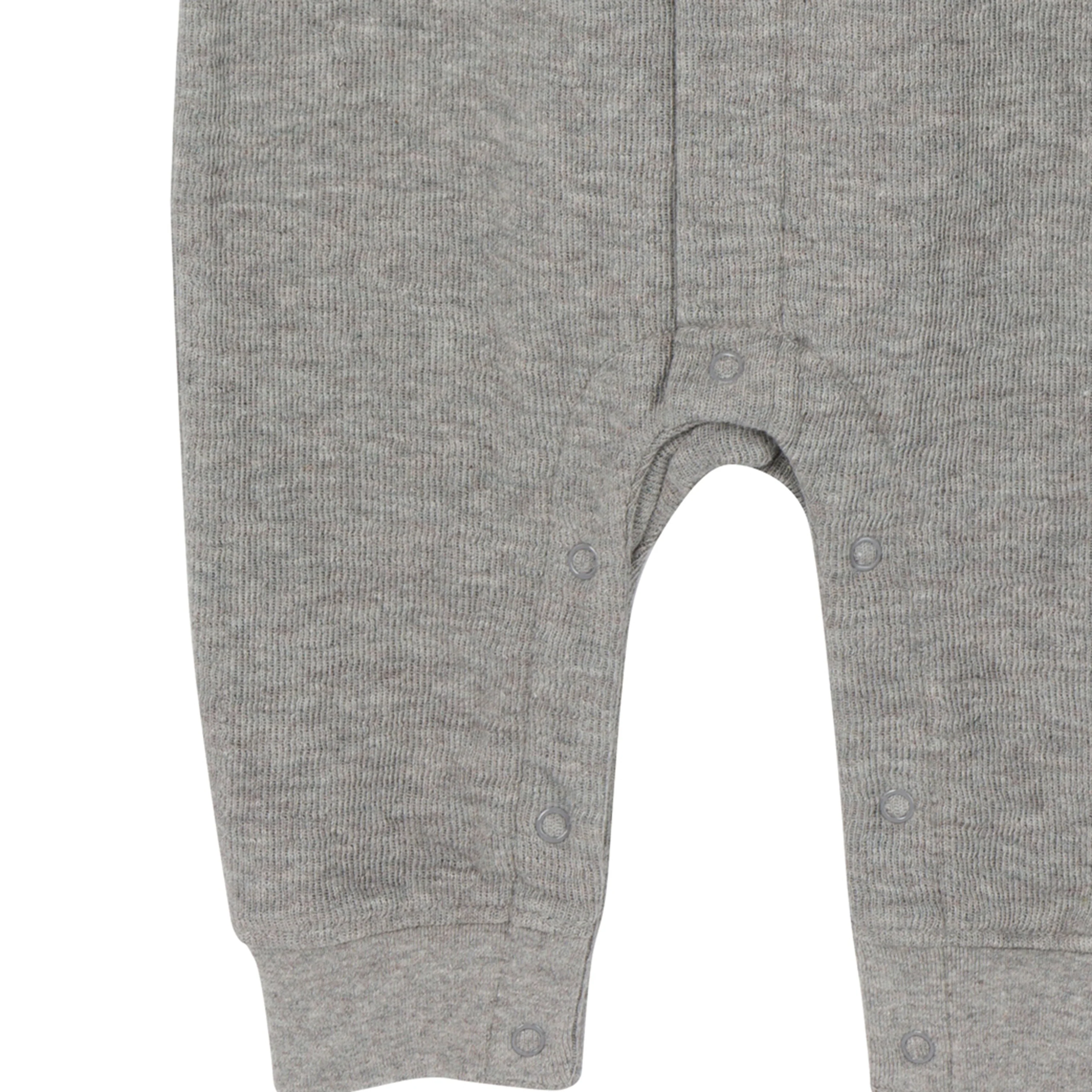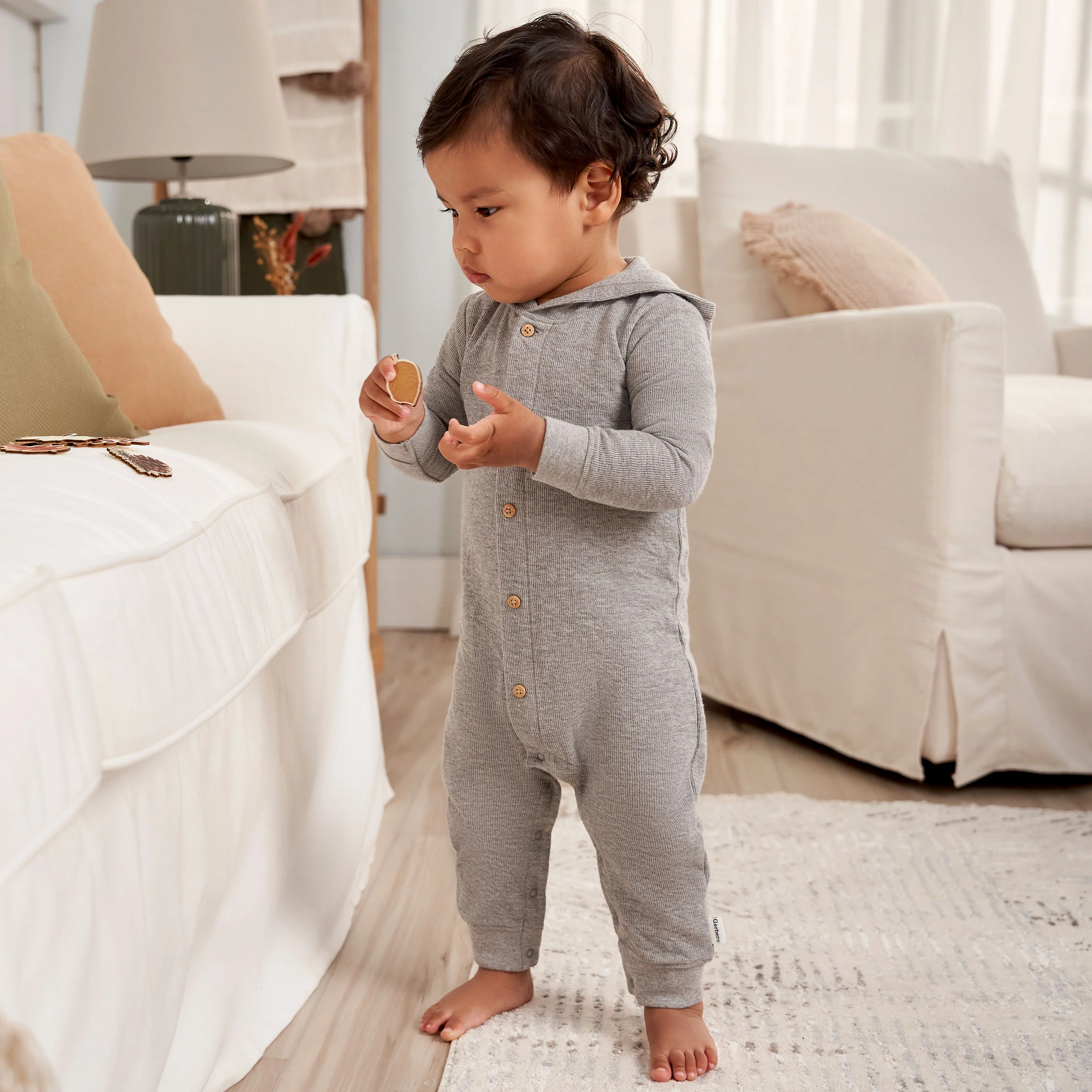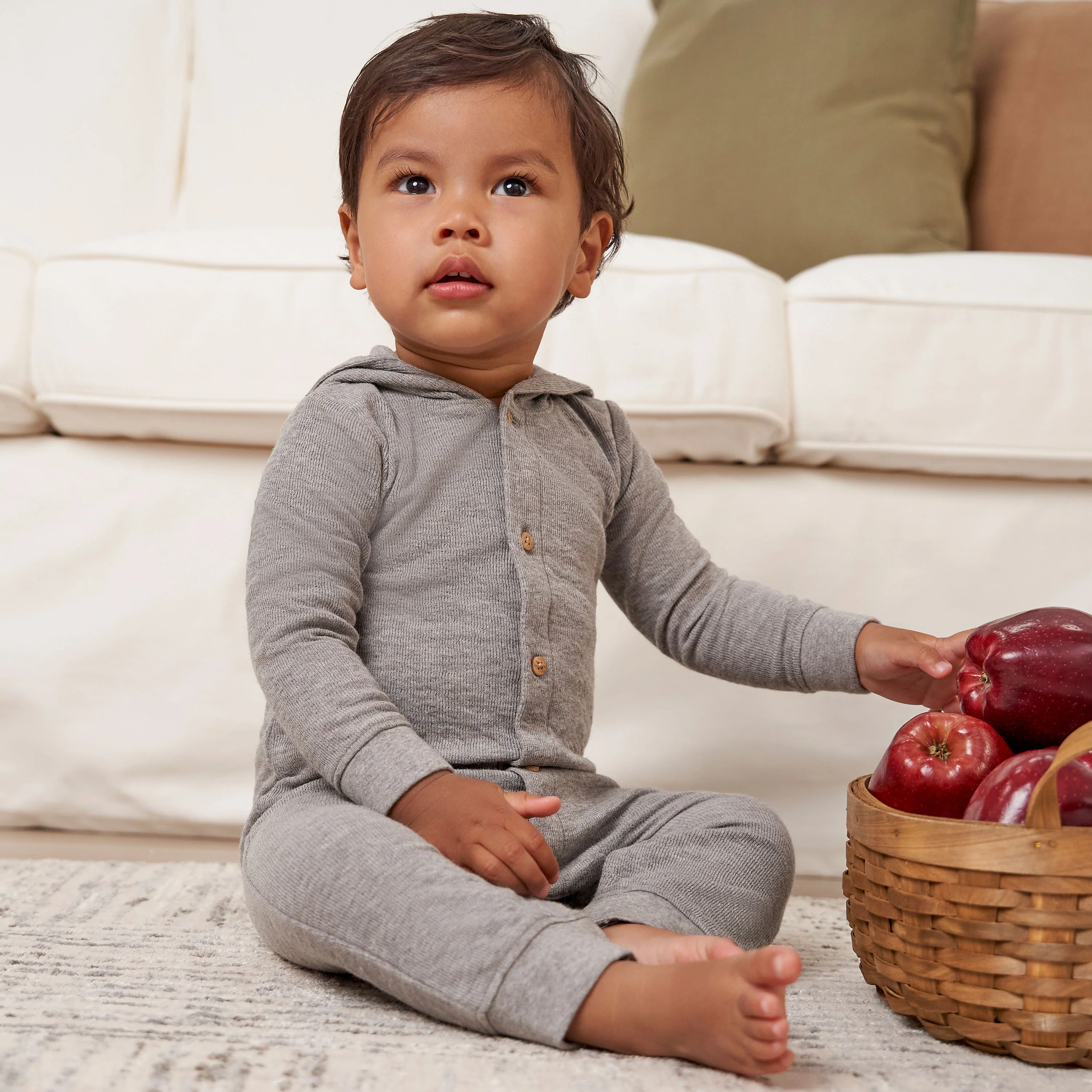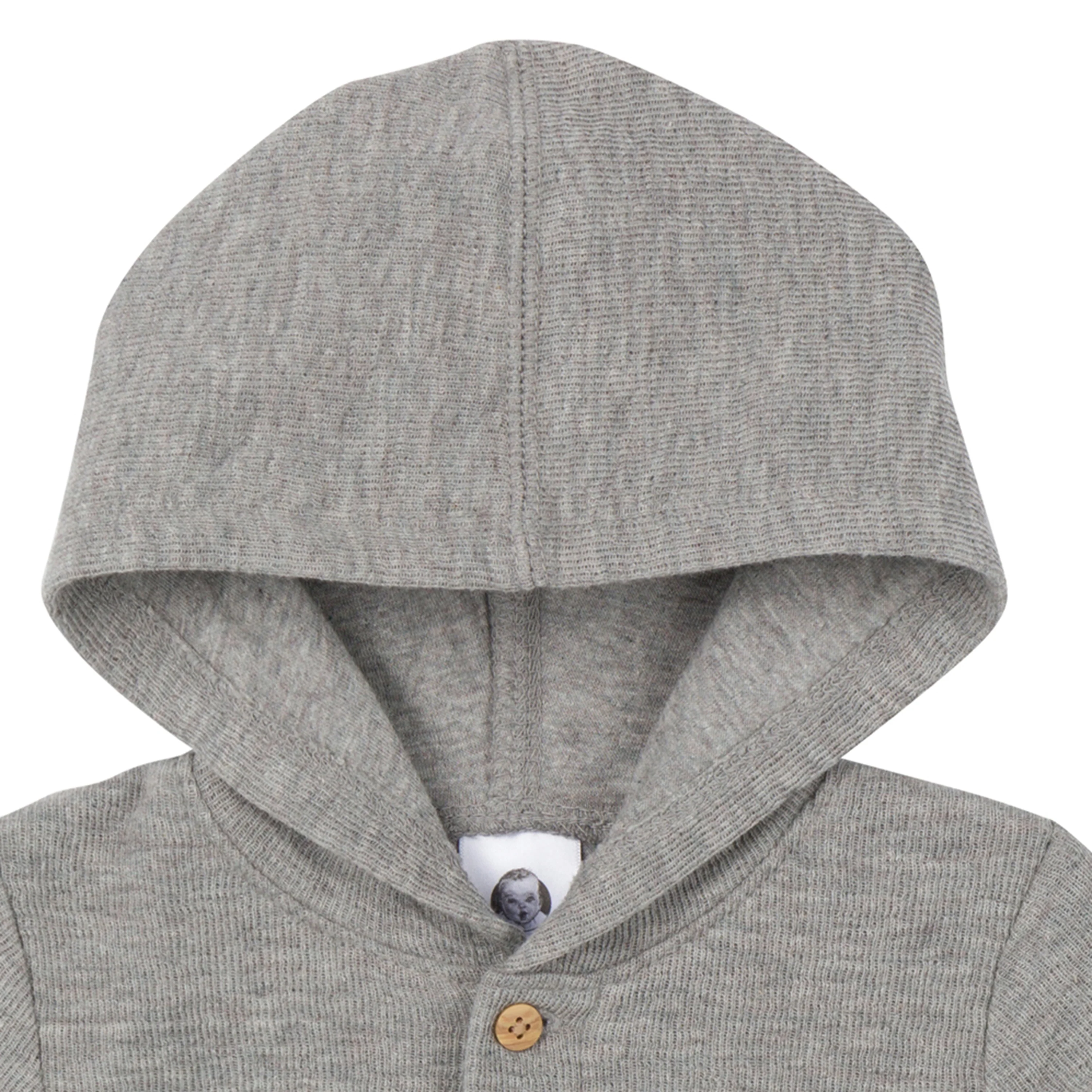 Our grey heather hooded baby romper will fast become a favorite! Designed for comfort and convenience, it’s made primarily from soft cotton that's gentle on sensitive skin. With spandex at the wrists and ankles, it’s flexible enough to move effortlessly with your active adventurer. Dressing is easy with the top two buttons opening to allow easy slip on, and convenient leg snaps simplify diaper changes. Plus, the cozy hood provides extra warmth on chilly days, making the romper perfect for outdoor adventures. Our essentials have been independently certified with STANDARD 100 by OEKO-TEX® so that you don’t have to worry about harmful substances in your baby’s wardrobe.