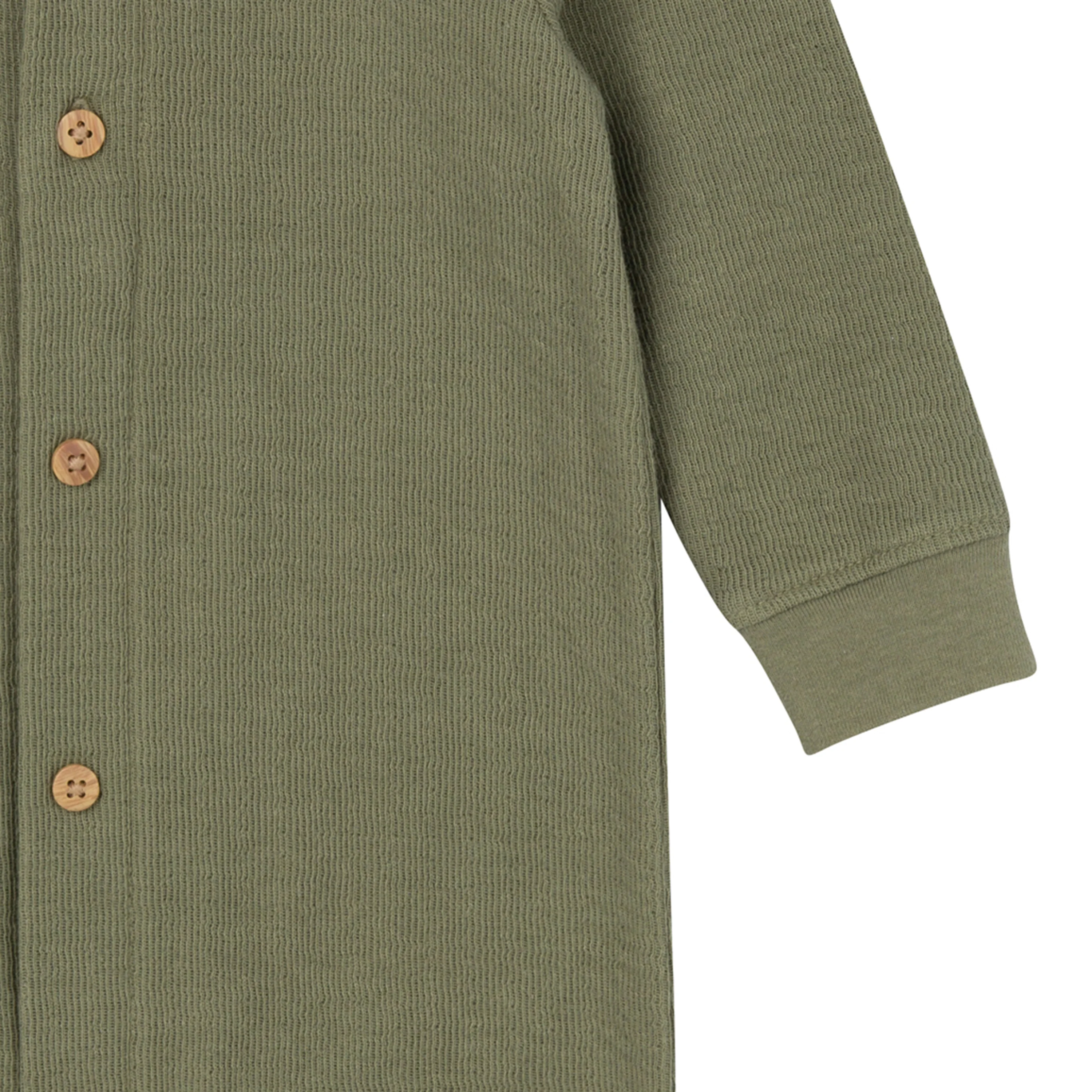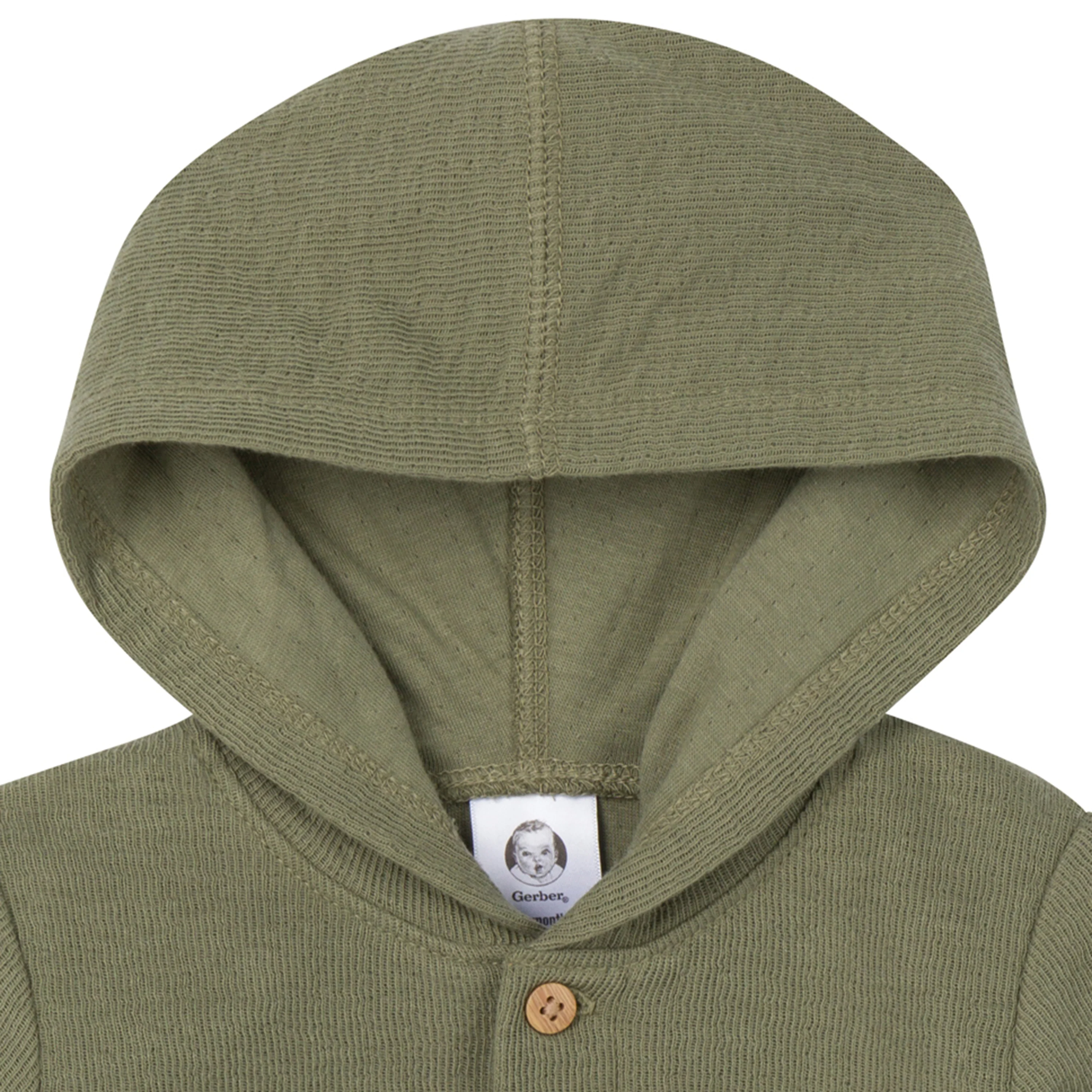 Our olive-green hooded baby romper will fast become a favorite! Designed for comfort and convenience, it’s made primarily from soft cotton that's gentle on sensitive skin. With spandex at the wrists and ankles, it’s flexible enough to move effortlessly with your active adventurer. Dressing is easy with the top two buttons opening to allow easy slip on, and convenient leg snaps simplify diaper changes. Plus, the cozy hood provides extra warmth on chilly days, making the romper perfect for outdoor adventures. Our essentials have been independently certified with STANDARD 100 by OEKO-TEX® so that you don’t have to worry about harmful substances in your baby’s wardrobe.