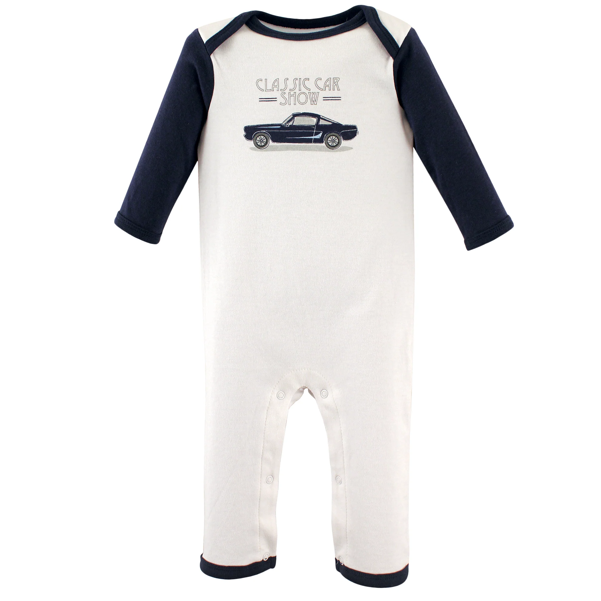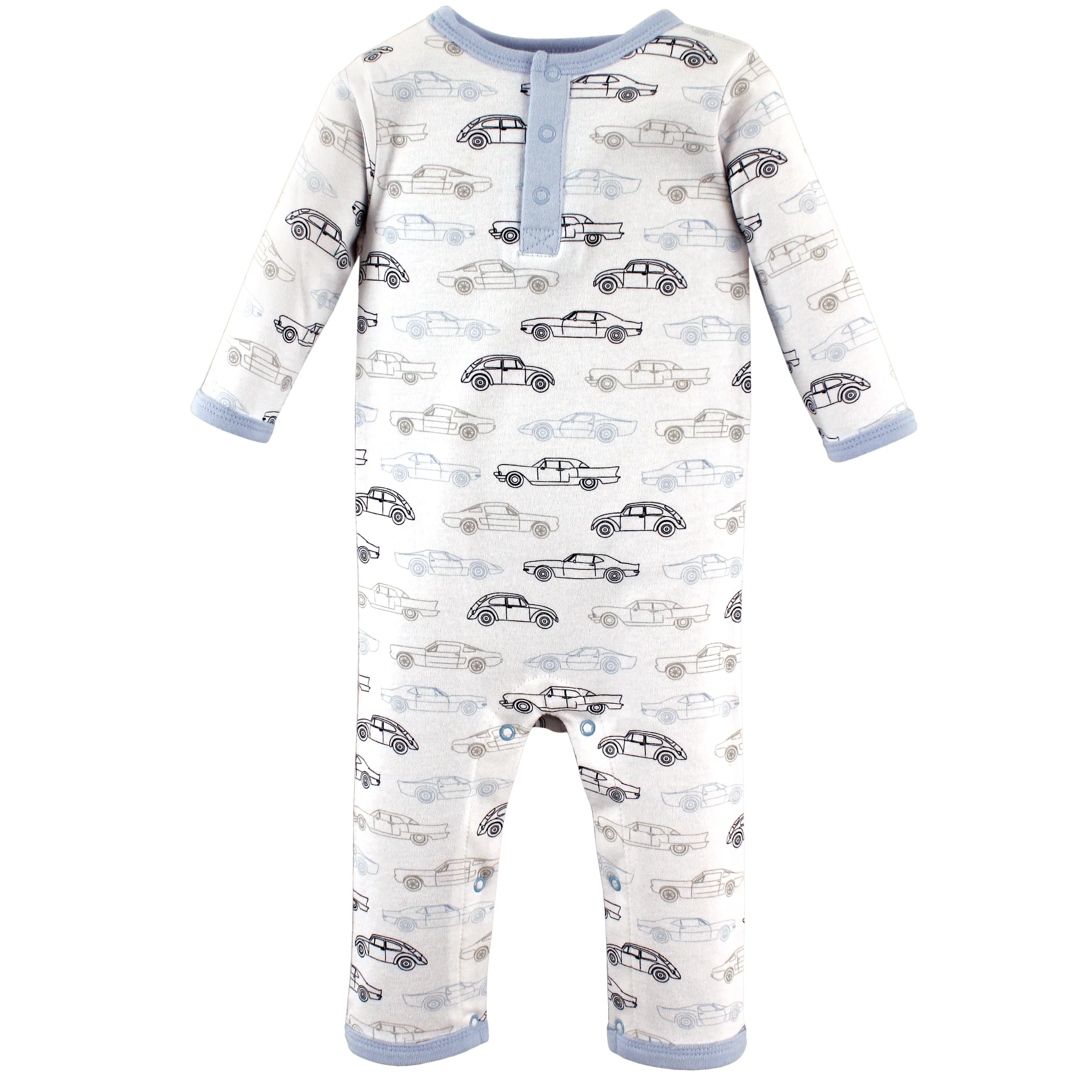 - Vintage car-print coverall with tagless henley neckline and color coordinated rib-knit trim