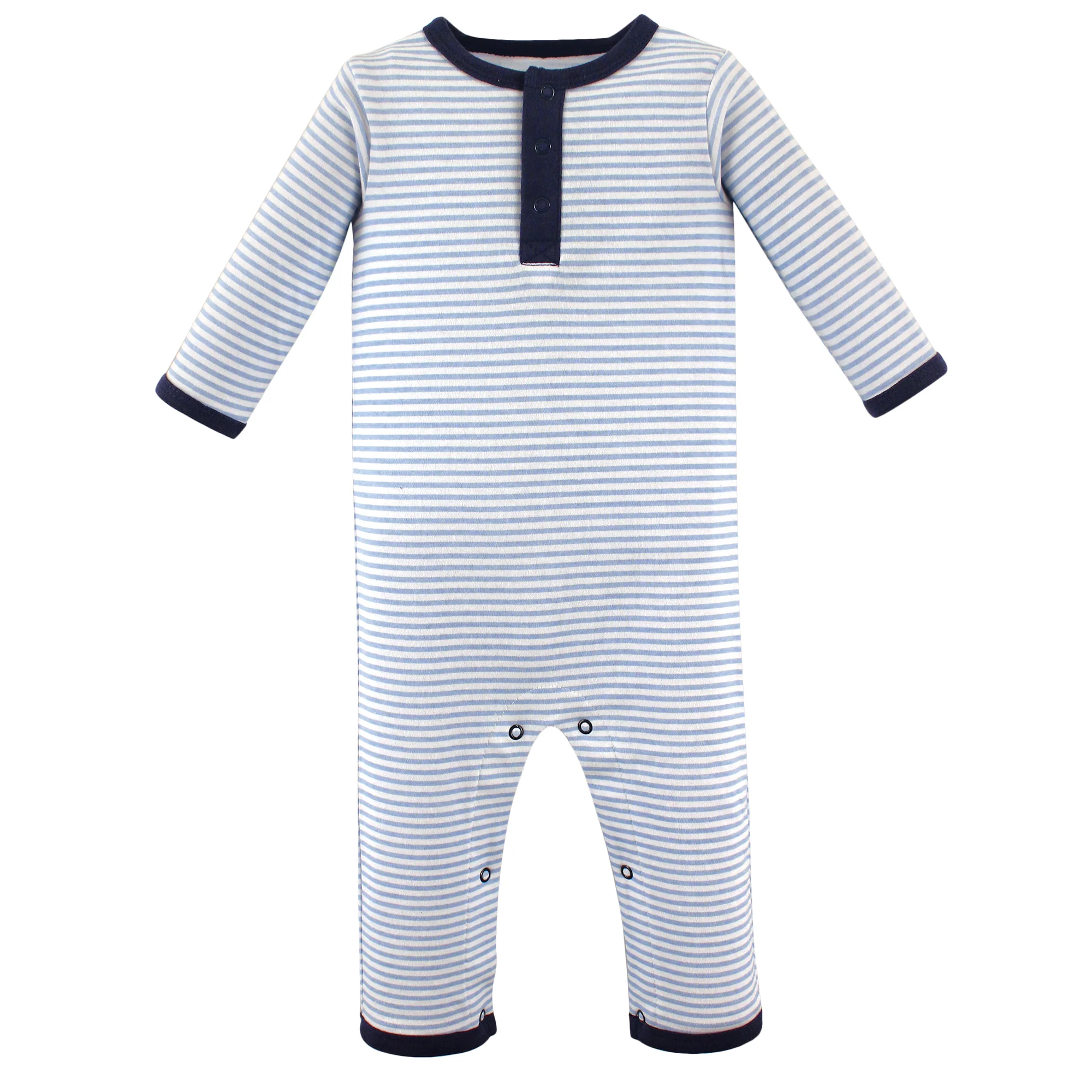 - Stripe-print coverall with tagless henley neckline and color coordinated rib-knit trim