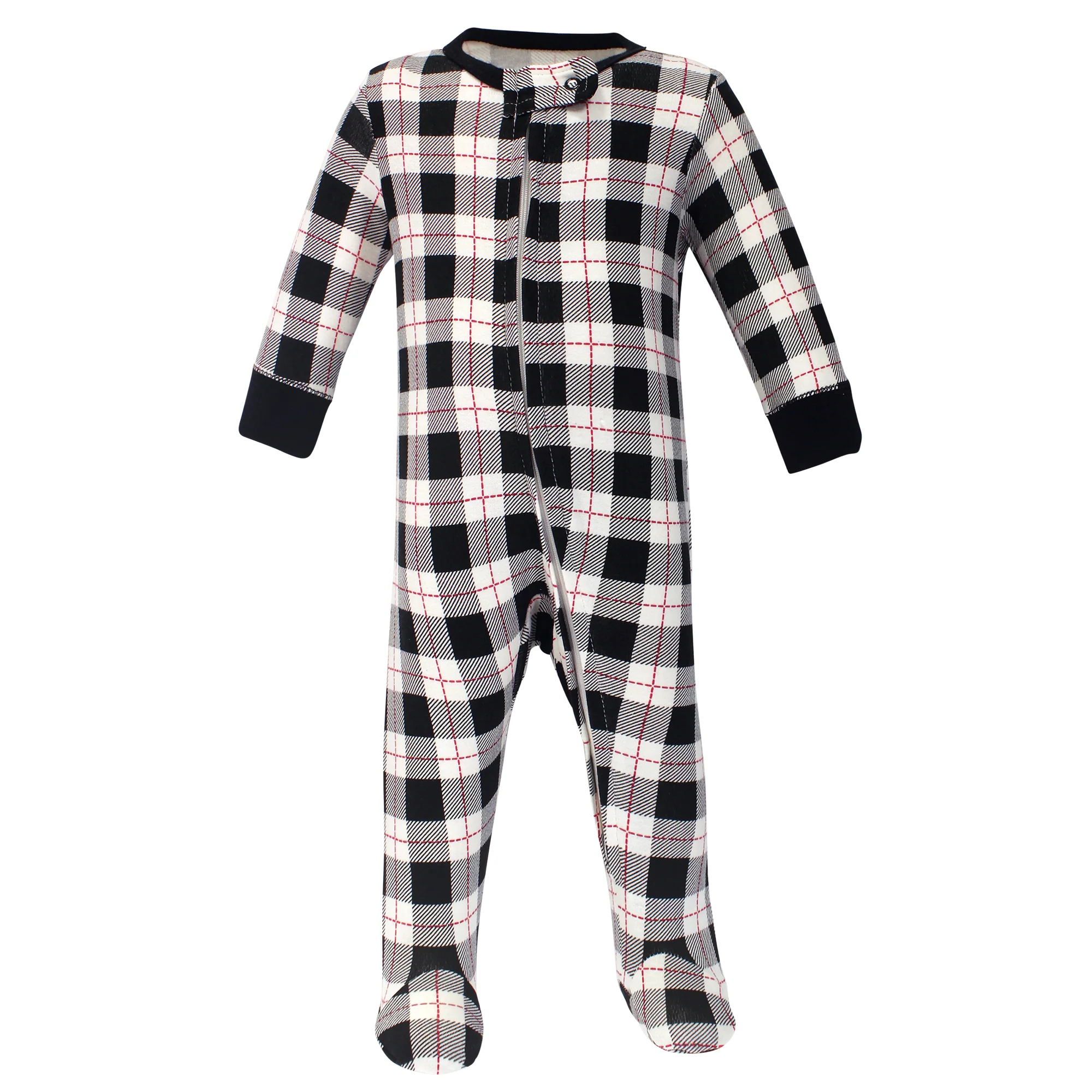 - 1 footie with black/white/red plaid design