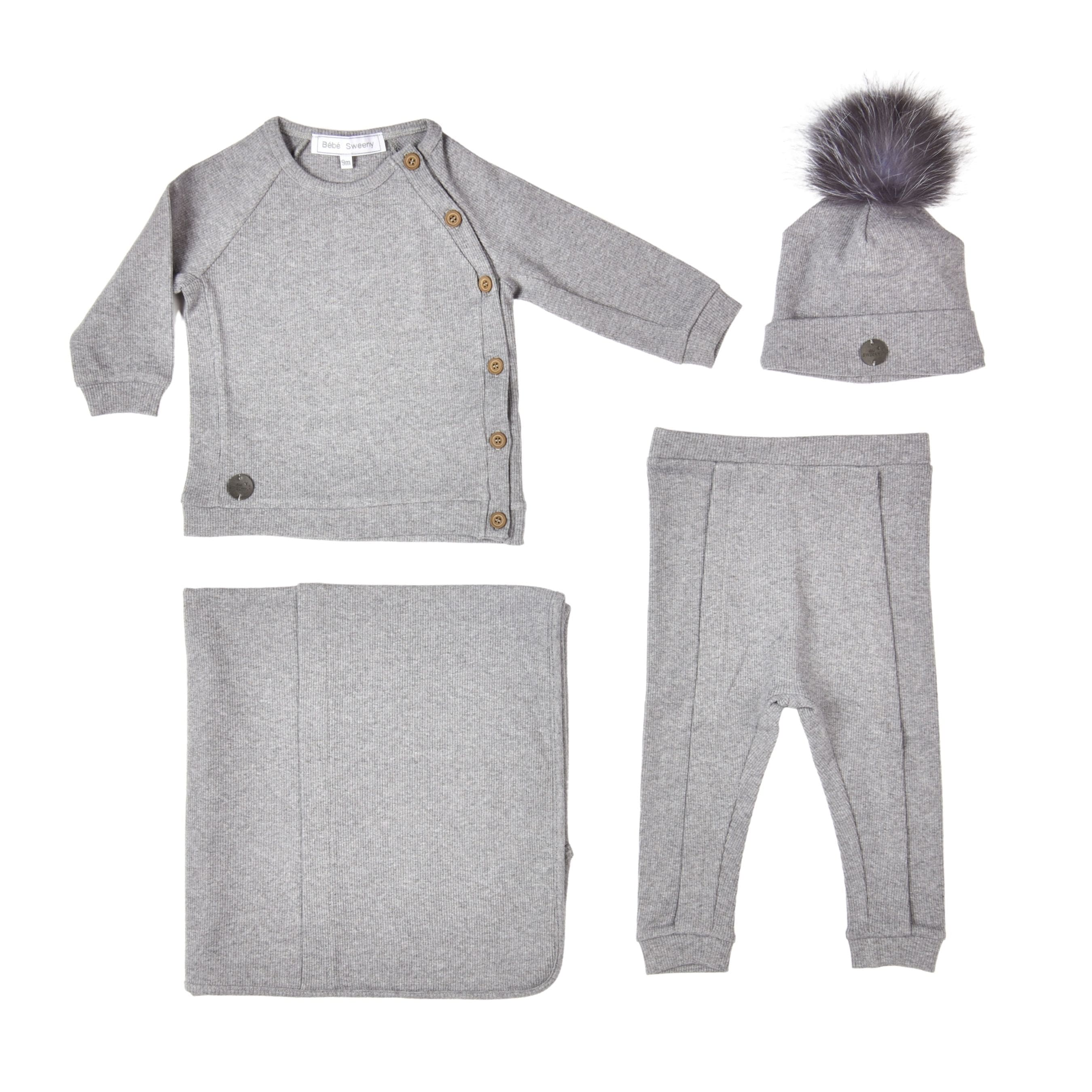 - Light grey ribbed jersey set (pants and sweater)