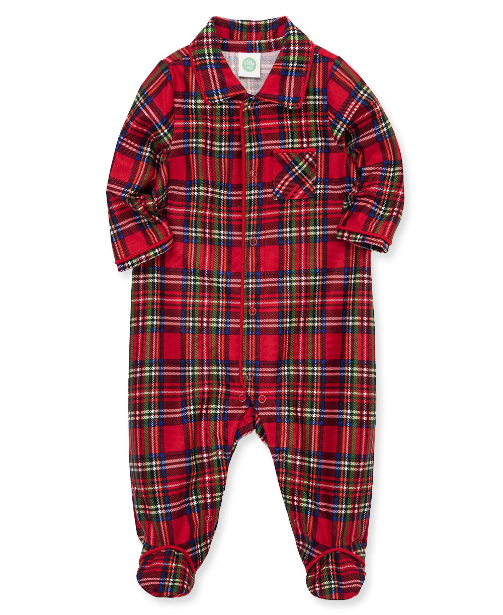 A classic collar and pocket decorate a newborn babys' pajama footie finished with effortless snaps and tartan.