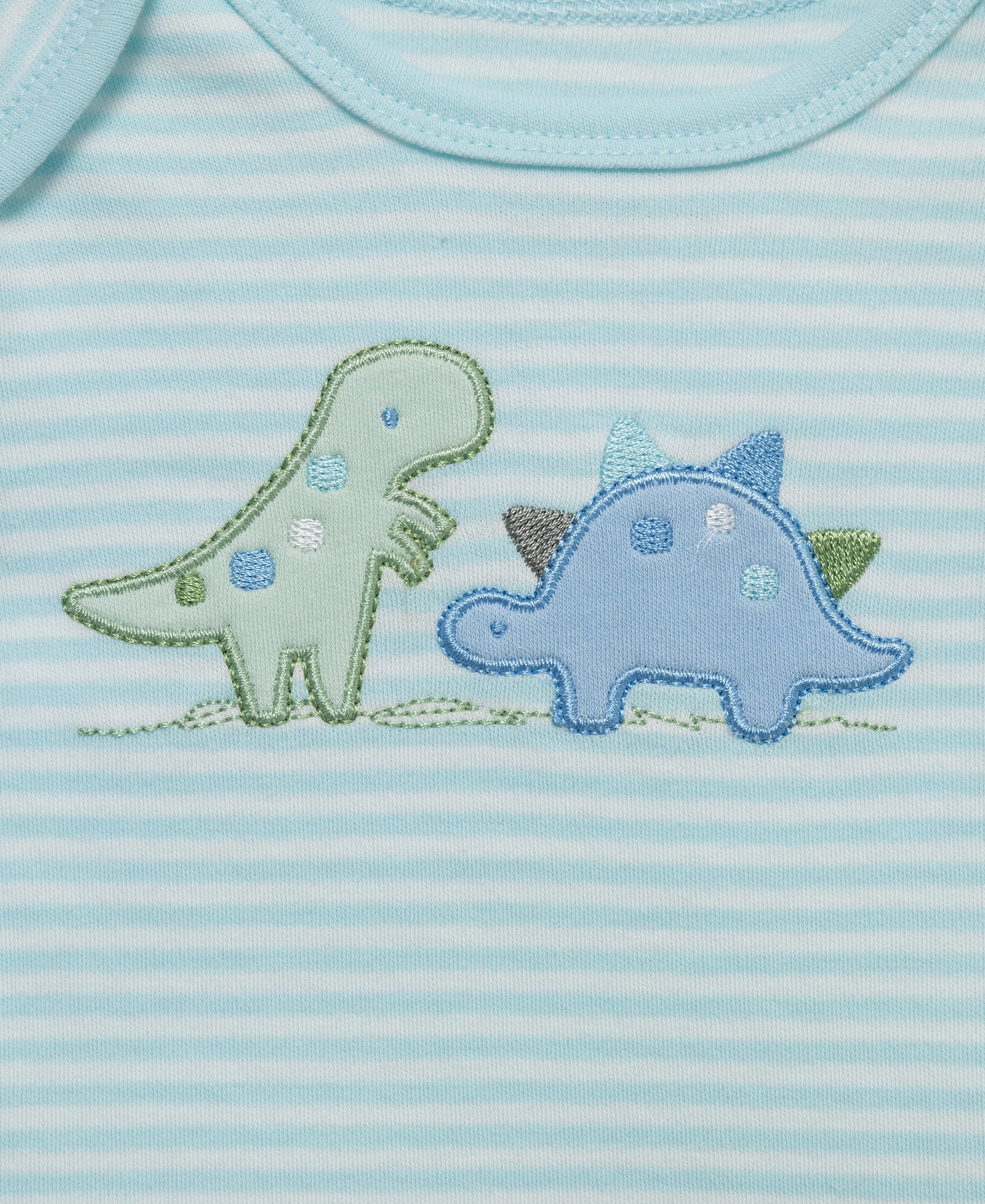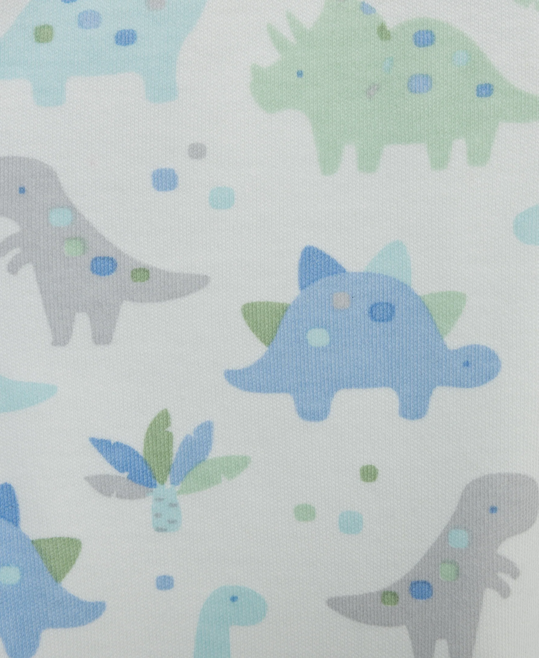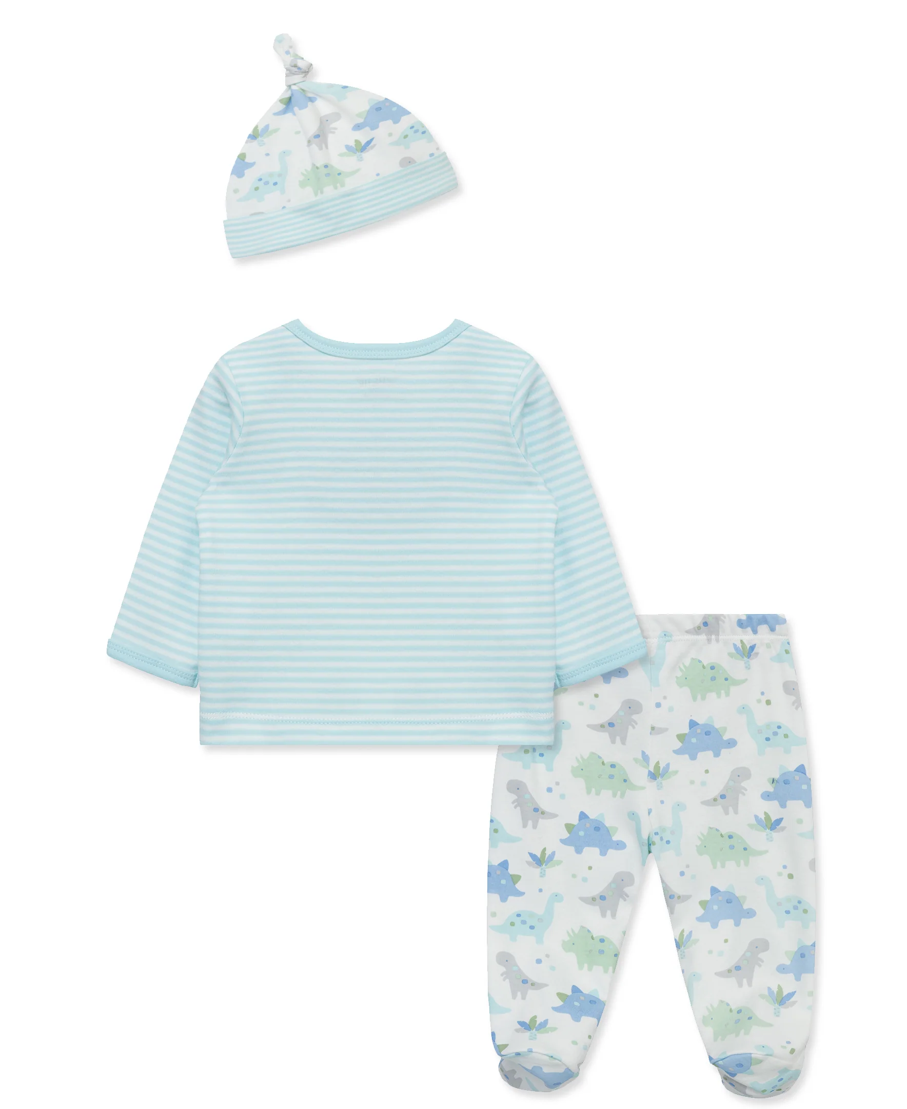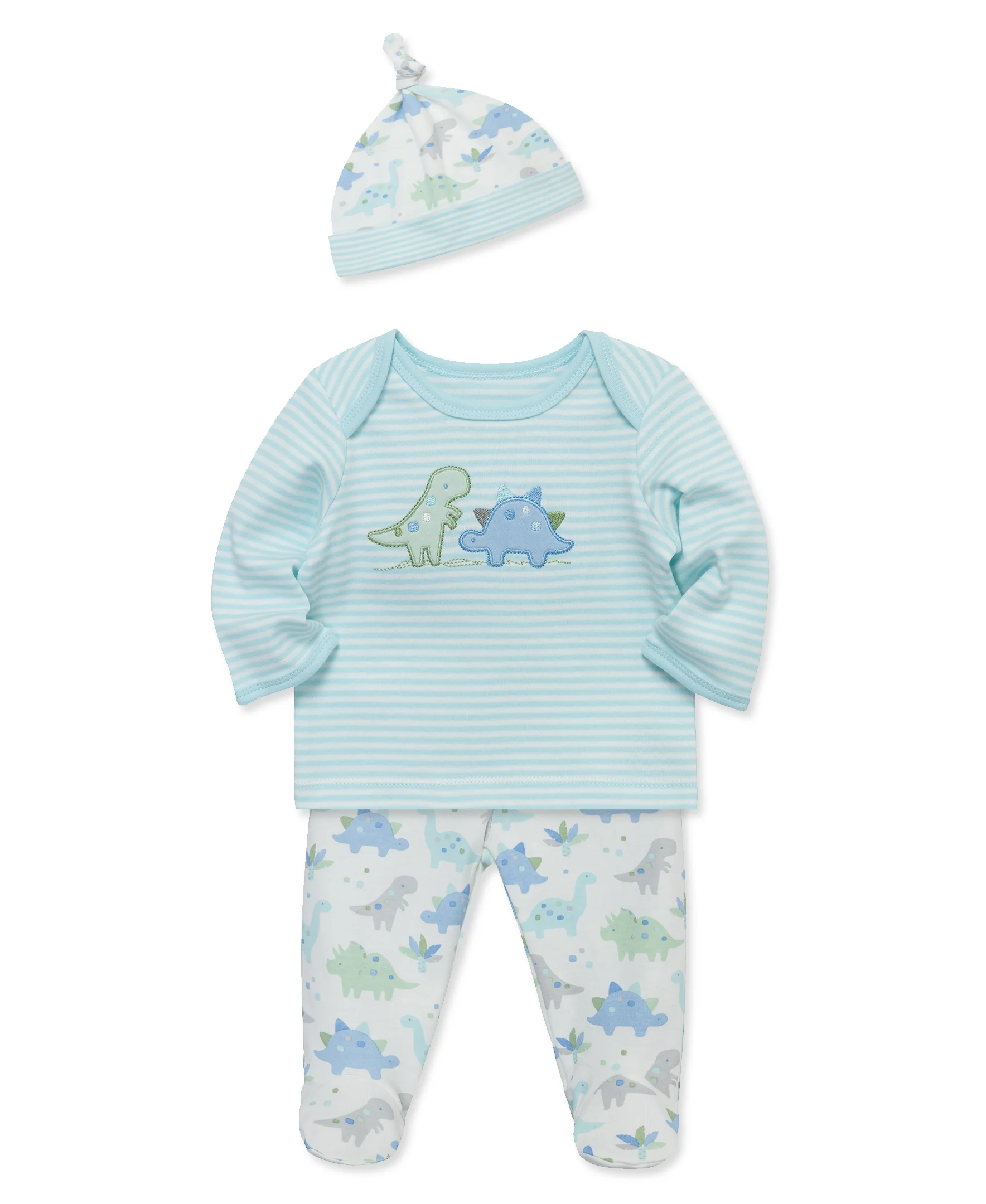Cute dinos are the theme of this baby boys' lapshoulder set. The set includes a lapshoulder top featuring dinos, dino print footed pants, and a matching hat.