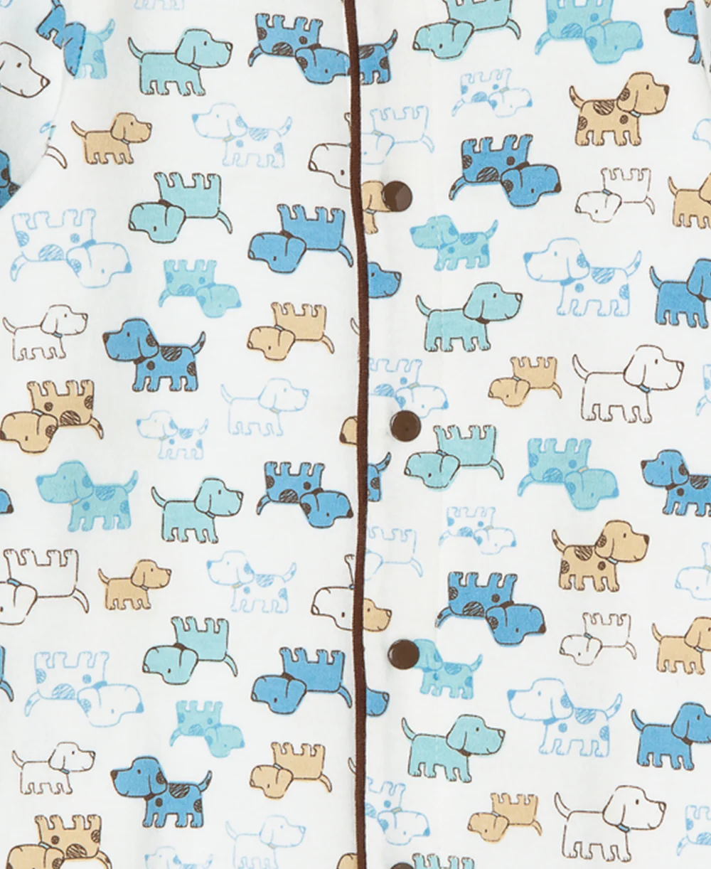 - Snap front footie with dog pattern, chocolate brown trim, and elbow patches