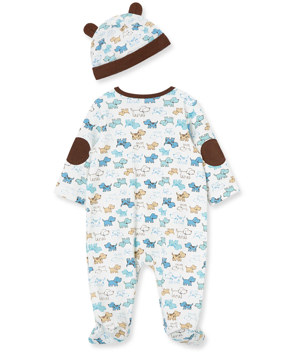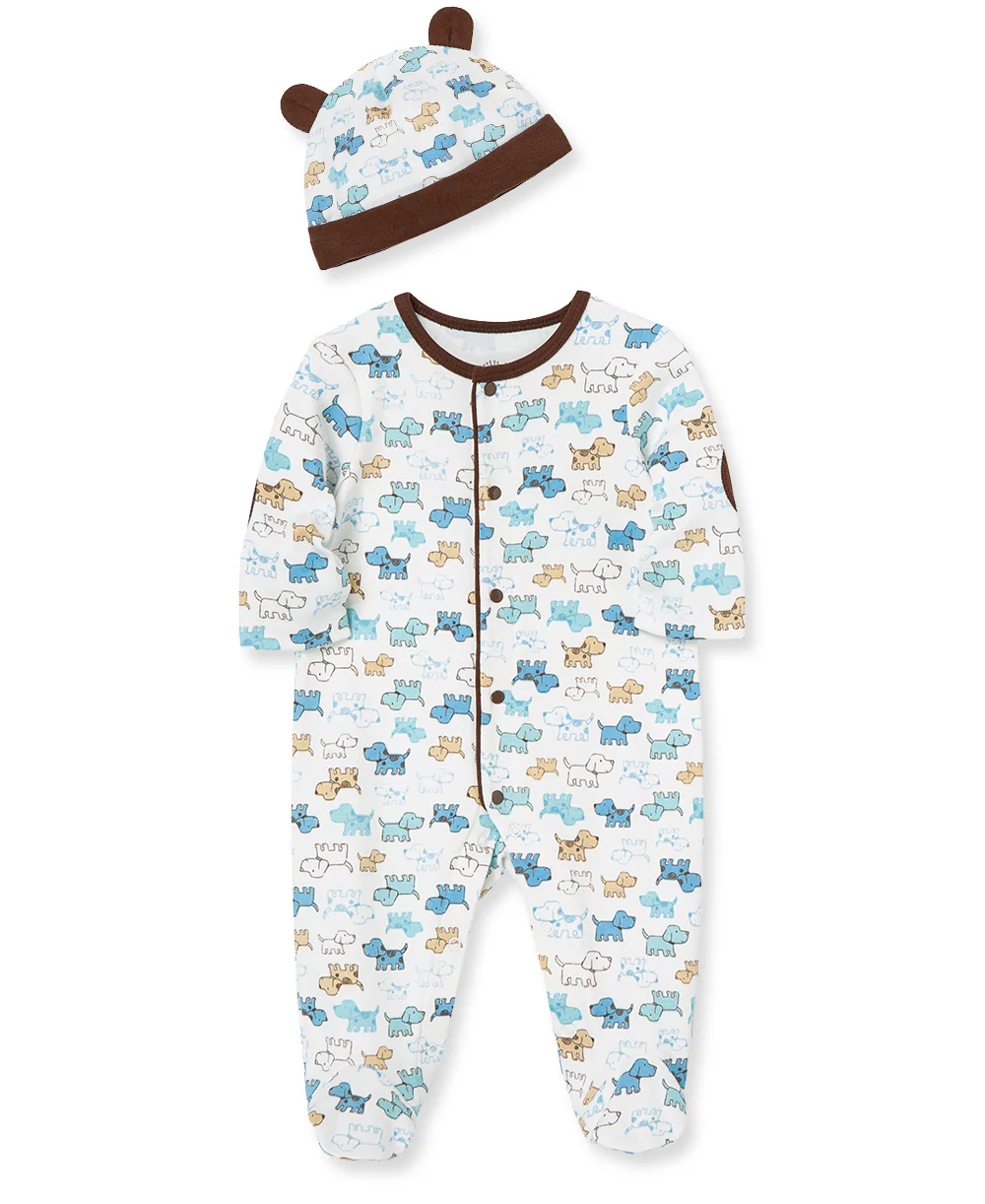 - Little Me's Cute Puppies Footie and Hat Set features a darling canine print in blue and brown on ivory