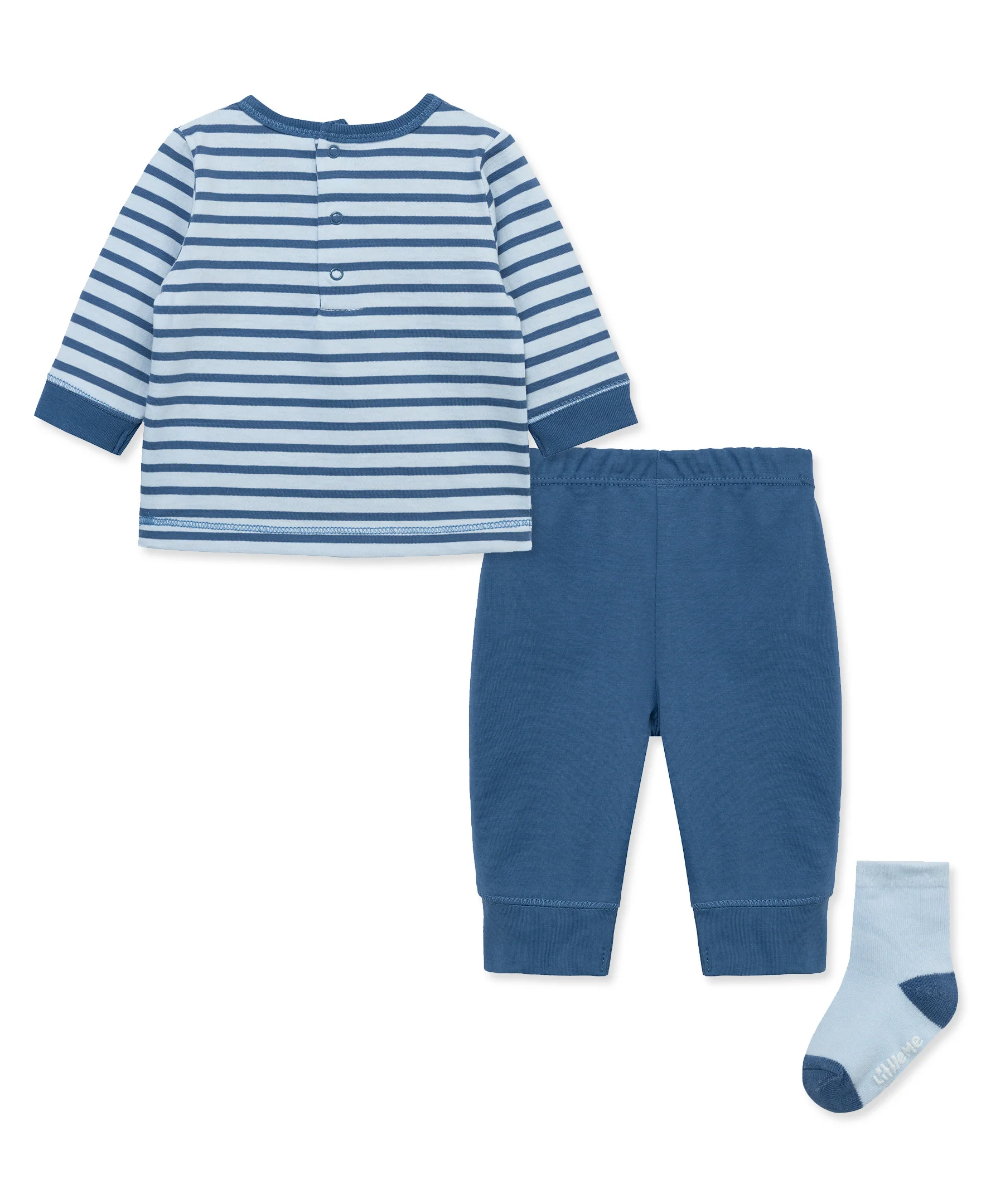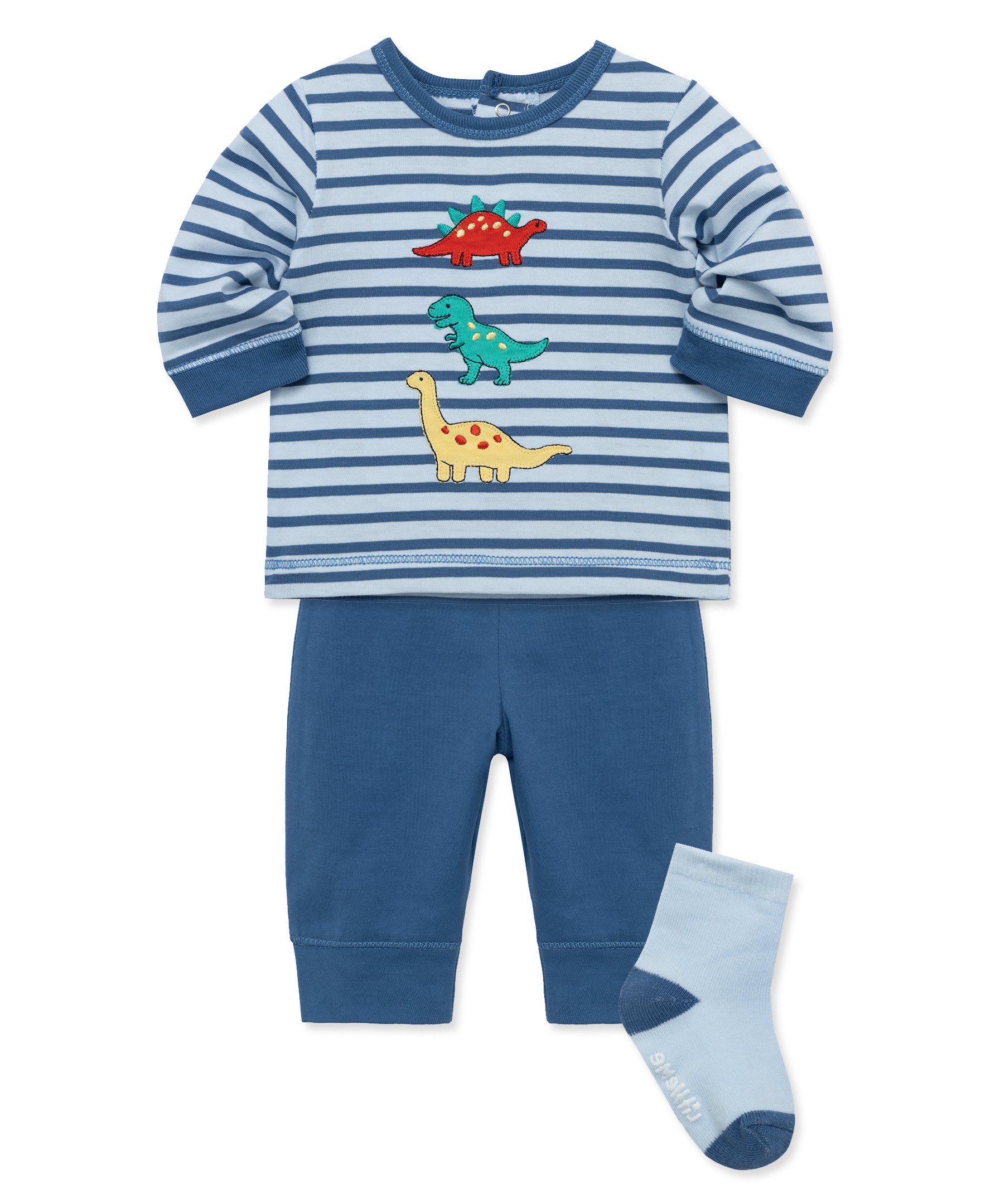 Prehistoric pals and stripes cover this baby boys' top, part of our jogger set. Complete is ultra comfy outfit with the matching socks.