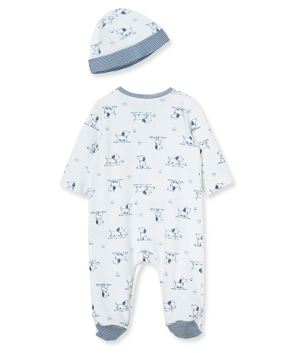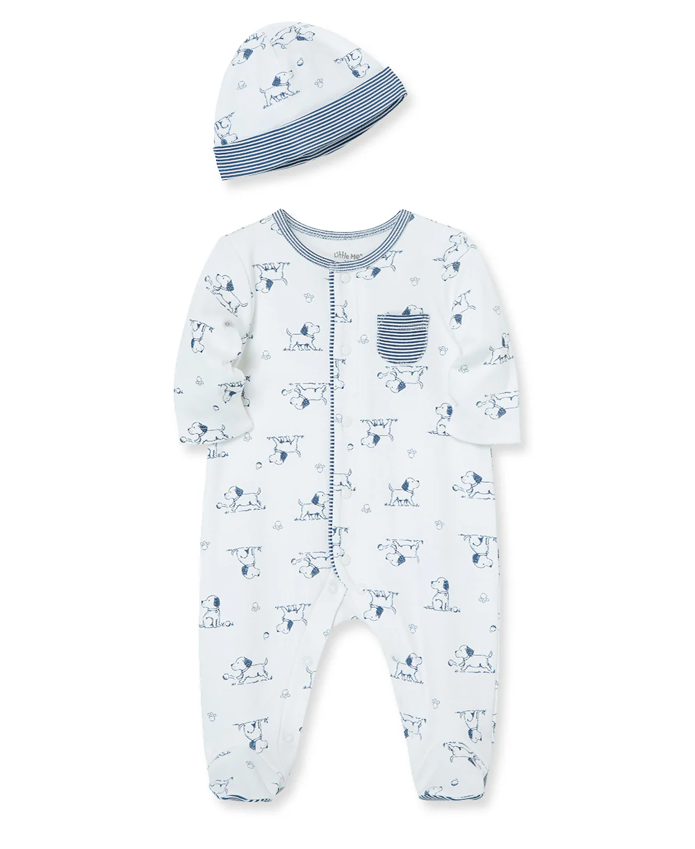 - Little Me's Puppy Toile Footie and Hat Set features a sweet and stylish print of a frolicking doggie in navy on white