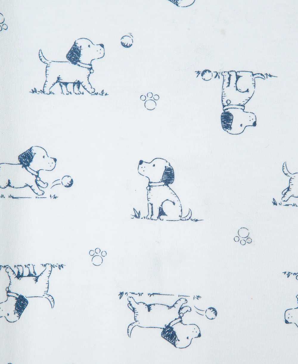 - Footie with snaps from ankle to chin, in puppy and ball print in navy on white; stripe trim, feet, and pocket detail