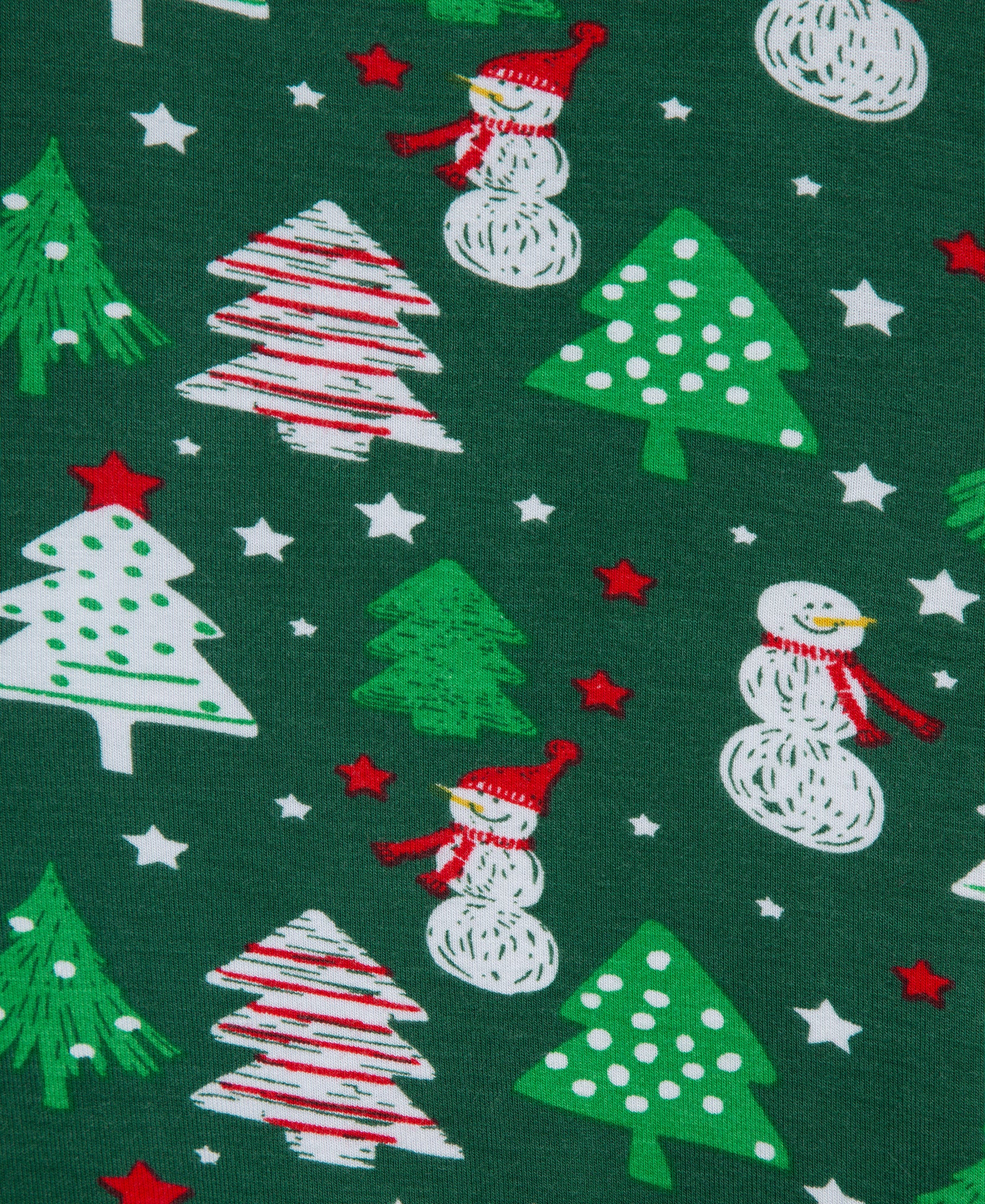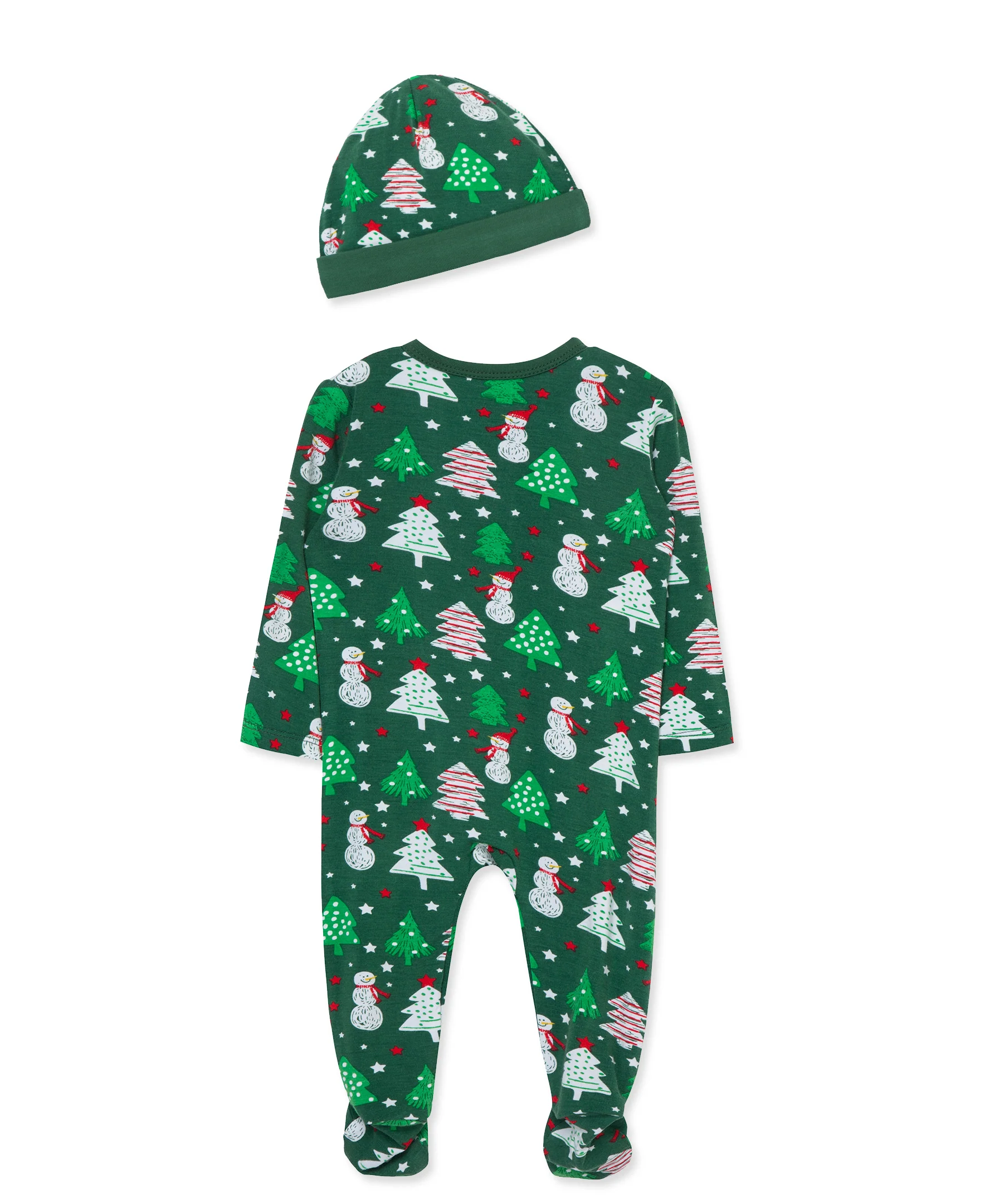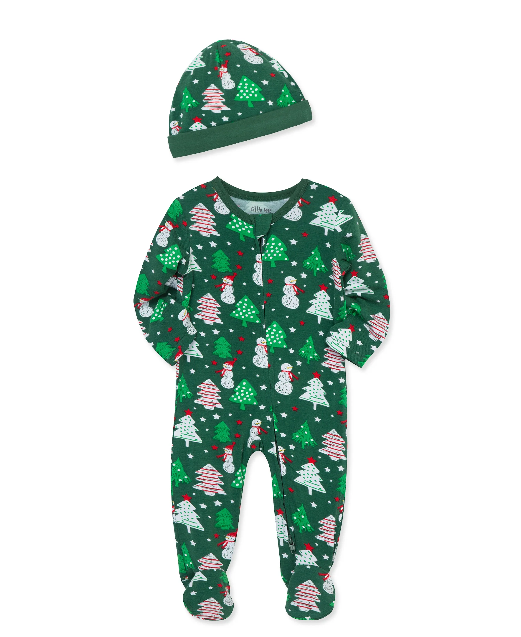A snowmen and trees pattern this bamboo viscose zip up footie. Pair it with the matching hat for a festive outfit.