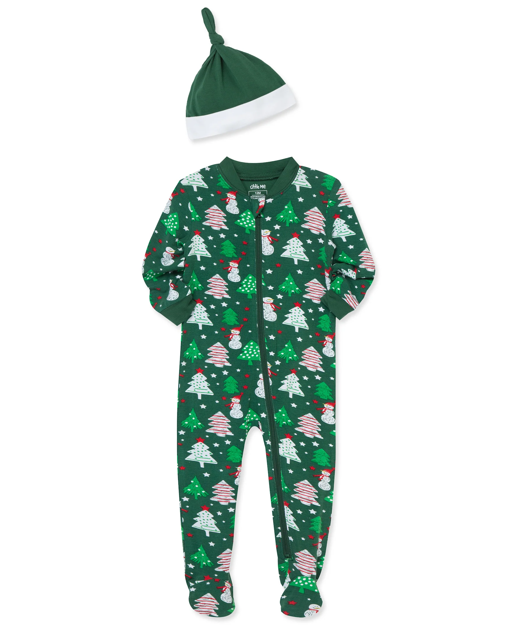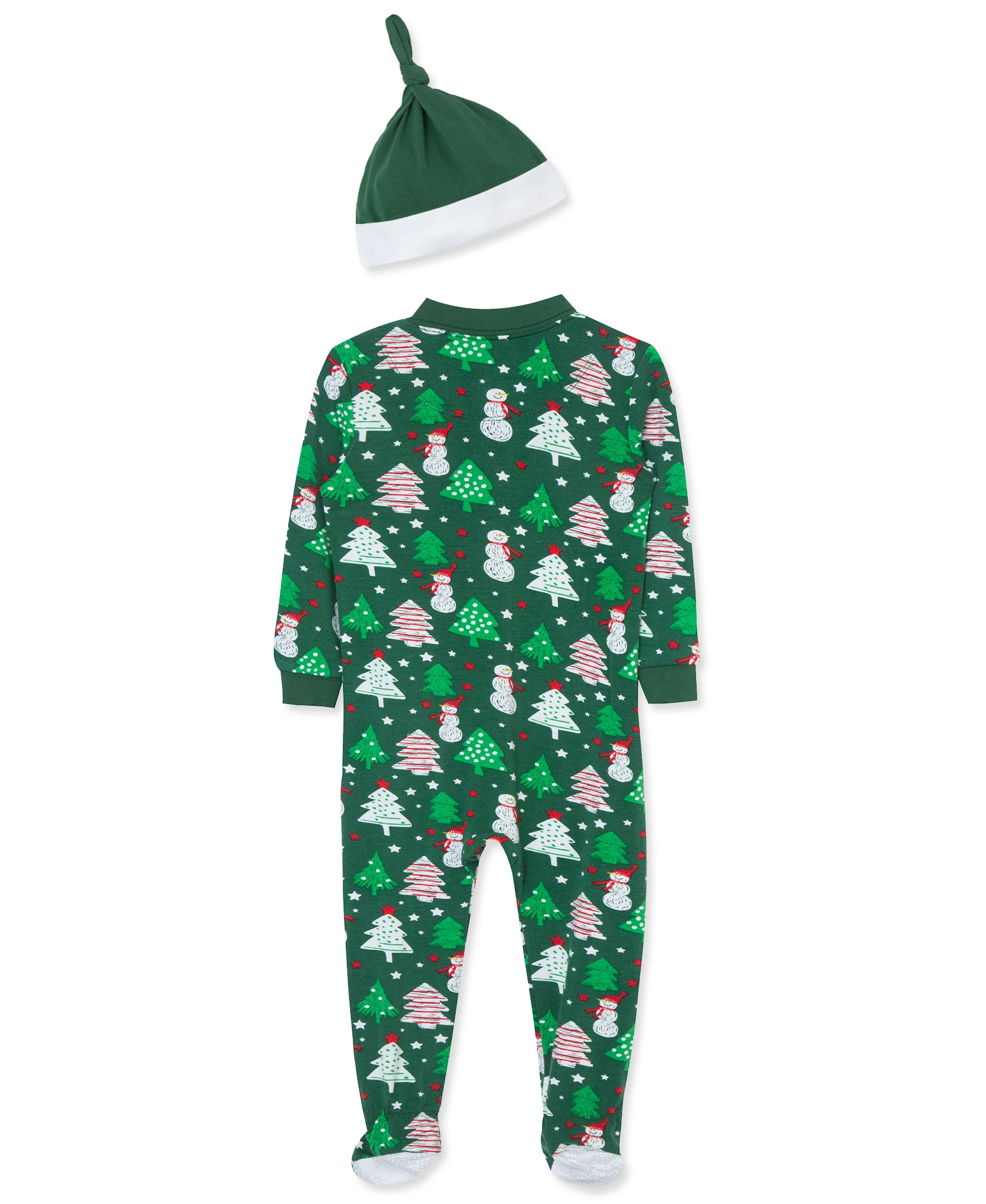 A snowmen and trees pattern this bamboo viscose zip up footie. Pair it with the matching hat for a festive outfit.