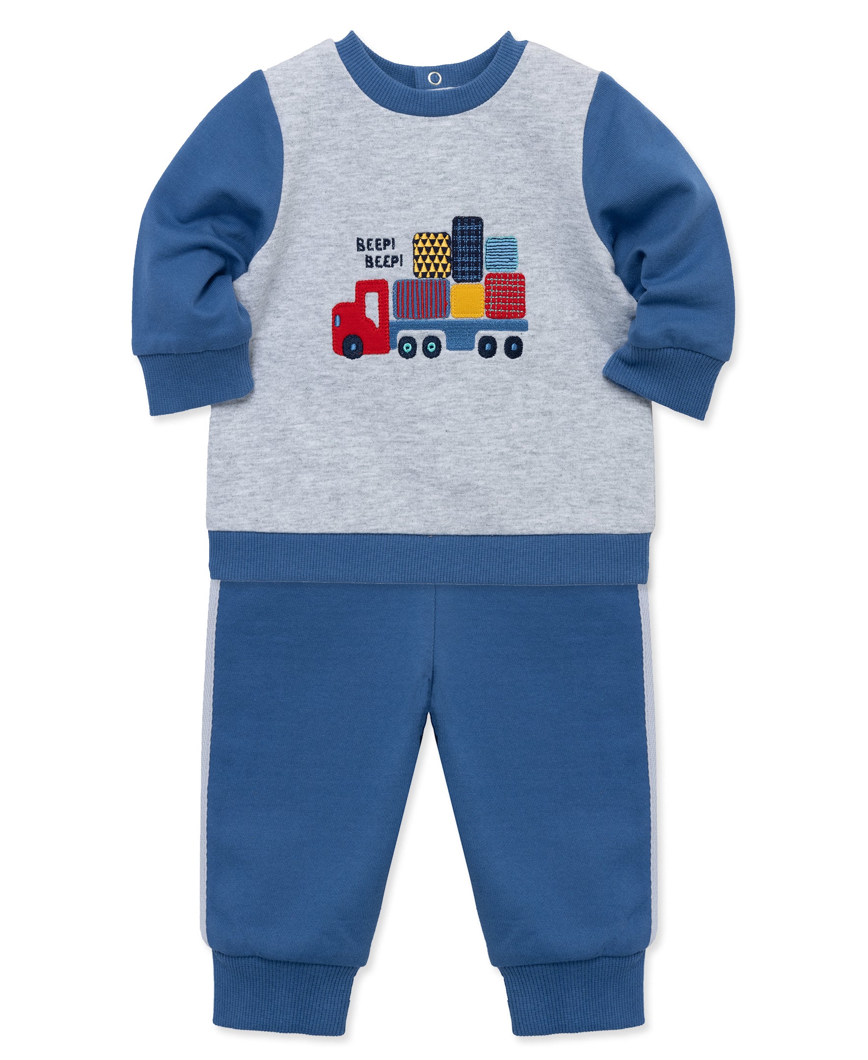 He will be ready to take on the day in our baby boys' active set. The set includes pull on pants and a sweatshirt featuring trucks.