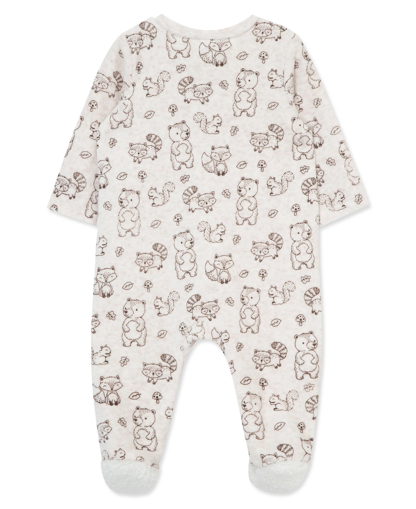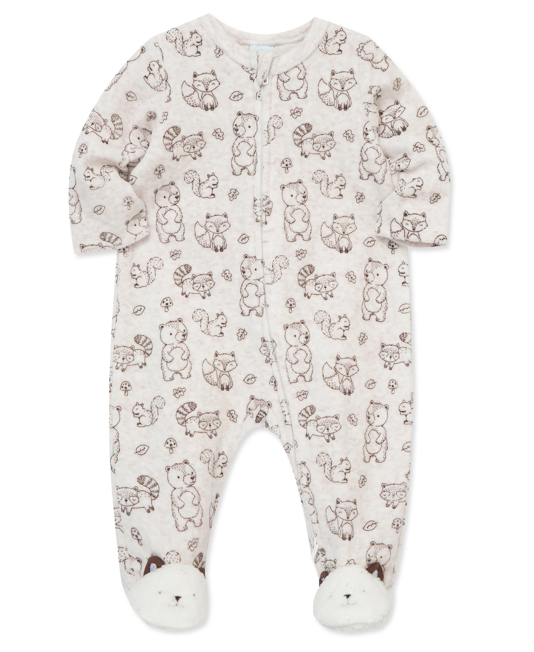 Fun woodland animals cover this baby boys' velour footie sure to keep hime cozy.