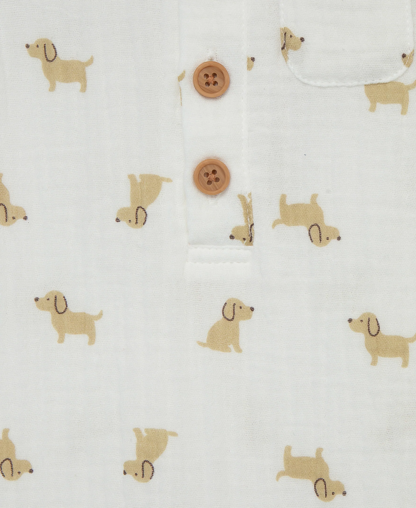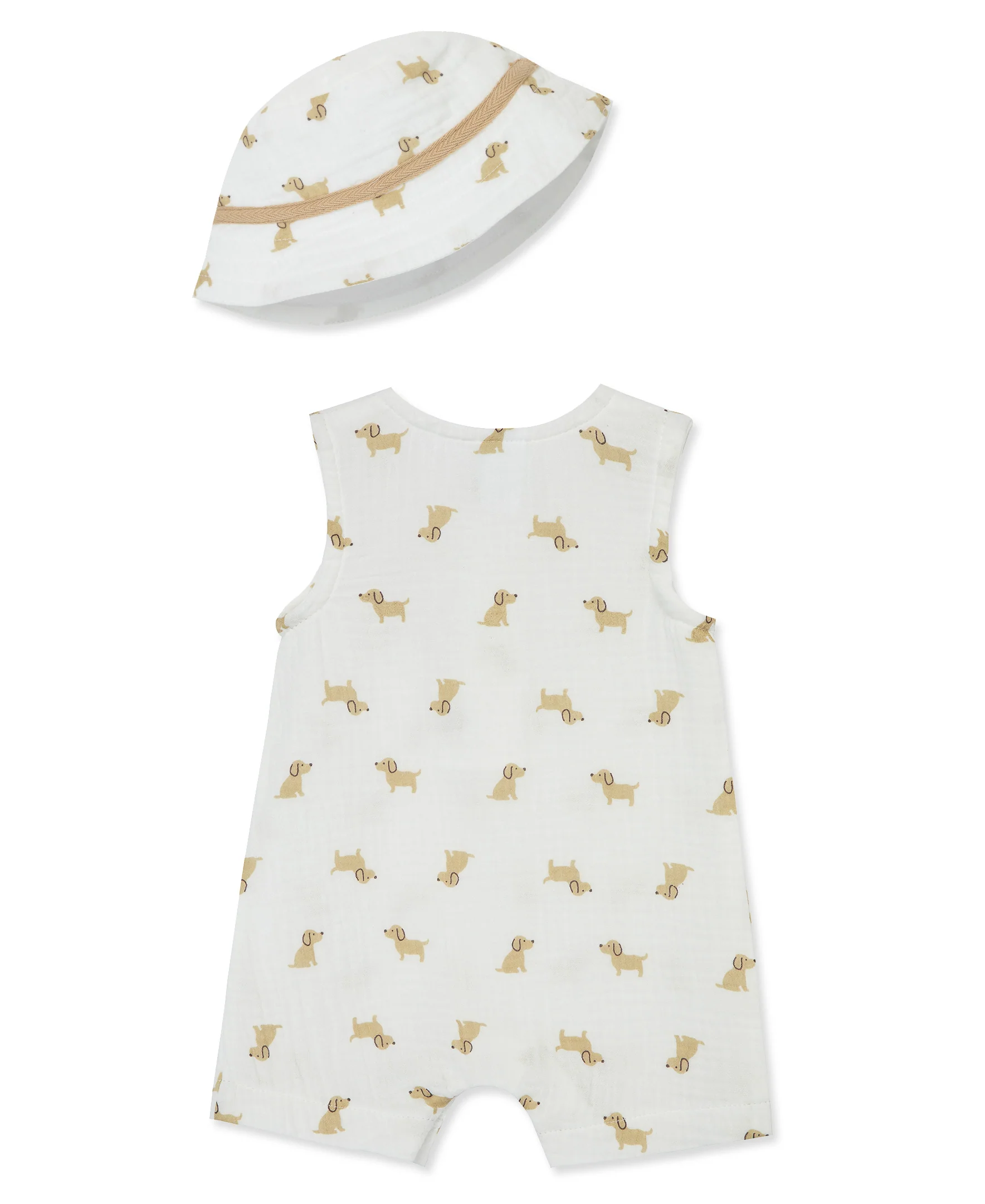 A puppy print covers this baby boys' romper and hat set perfect for a day in the sun.