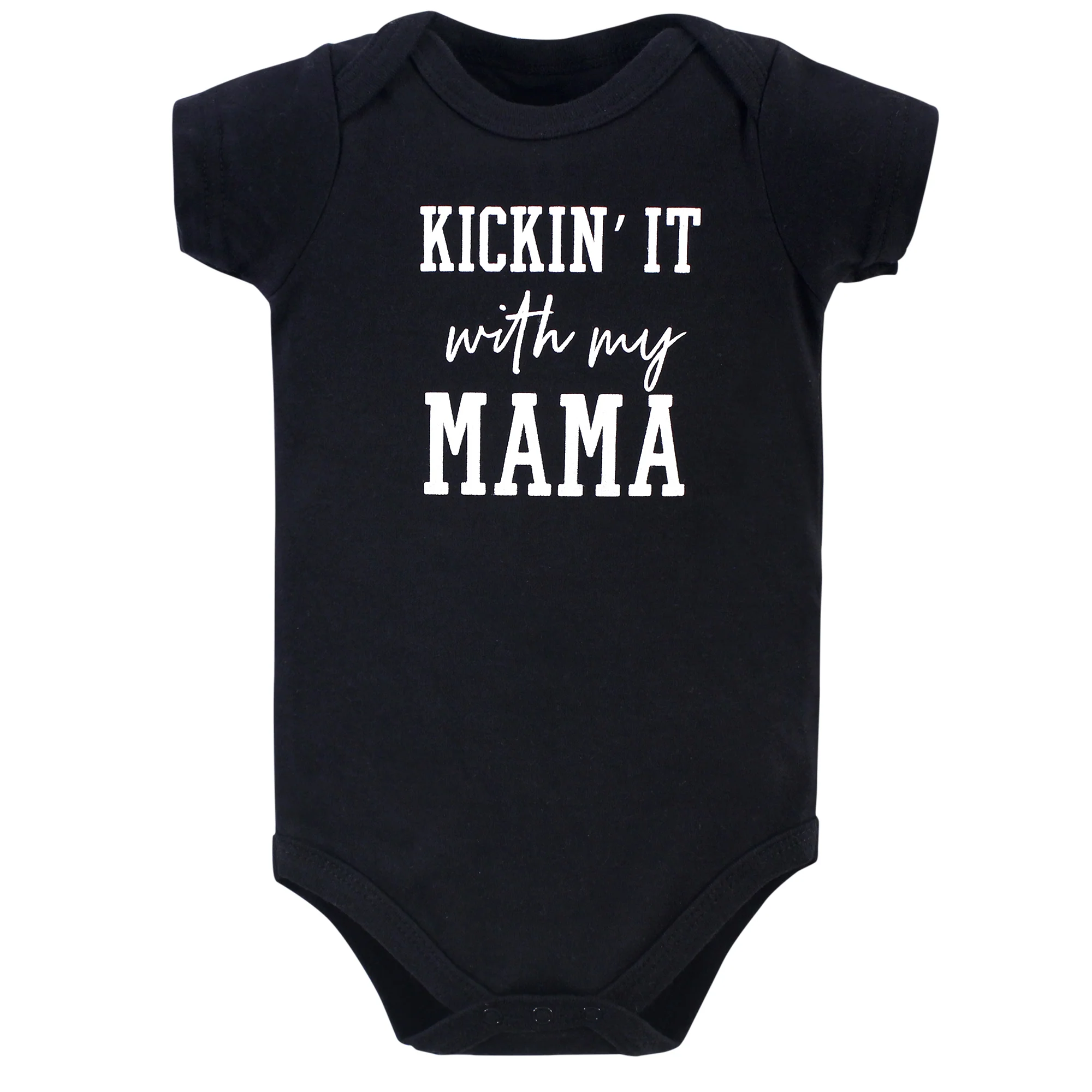 - Short sleeve bodysuit text that reads "Kickin' it with My Mama" and snap closures; 100% cotton