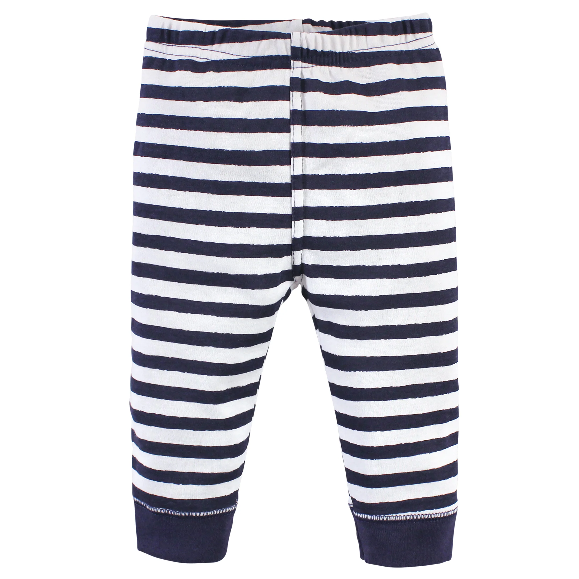 - Pair of pants with striped print, elastic waist, and ribbed cuffs on ankles; 100% cotton