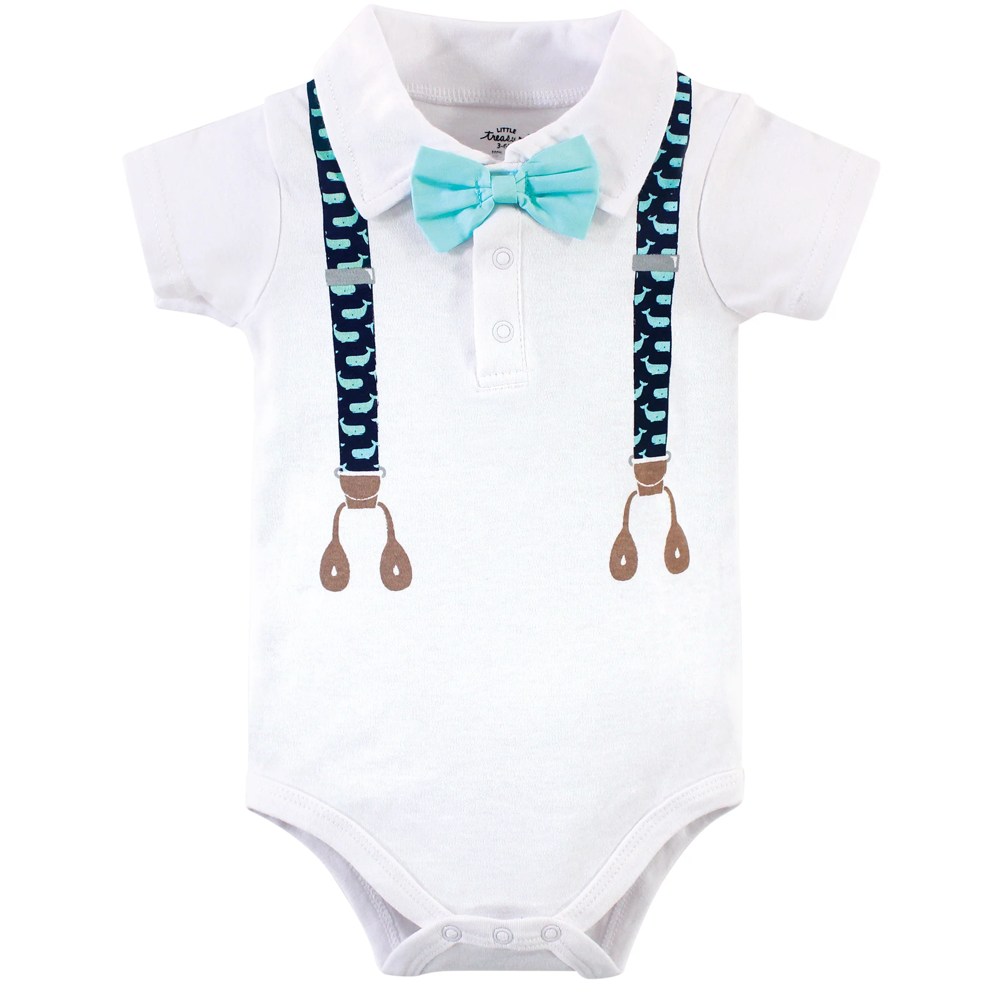 These super cute Little Treasure Whale Suspenders Bodysuits will be a great addition to your little one's wardrobe. This pack of 3 comes in fun colors, with different adorable designs. Made of 100% super soft cotton.