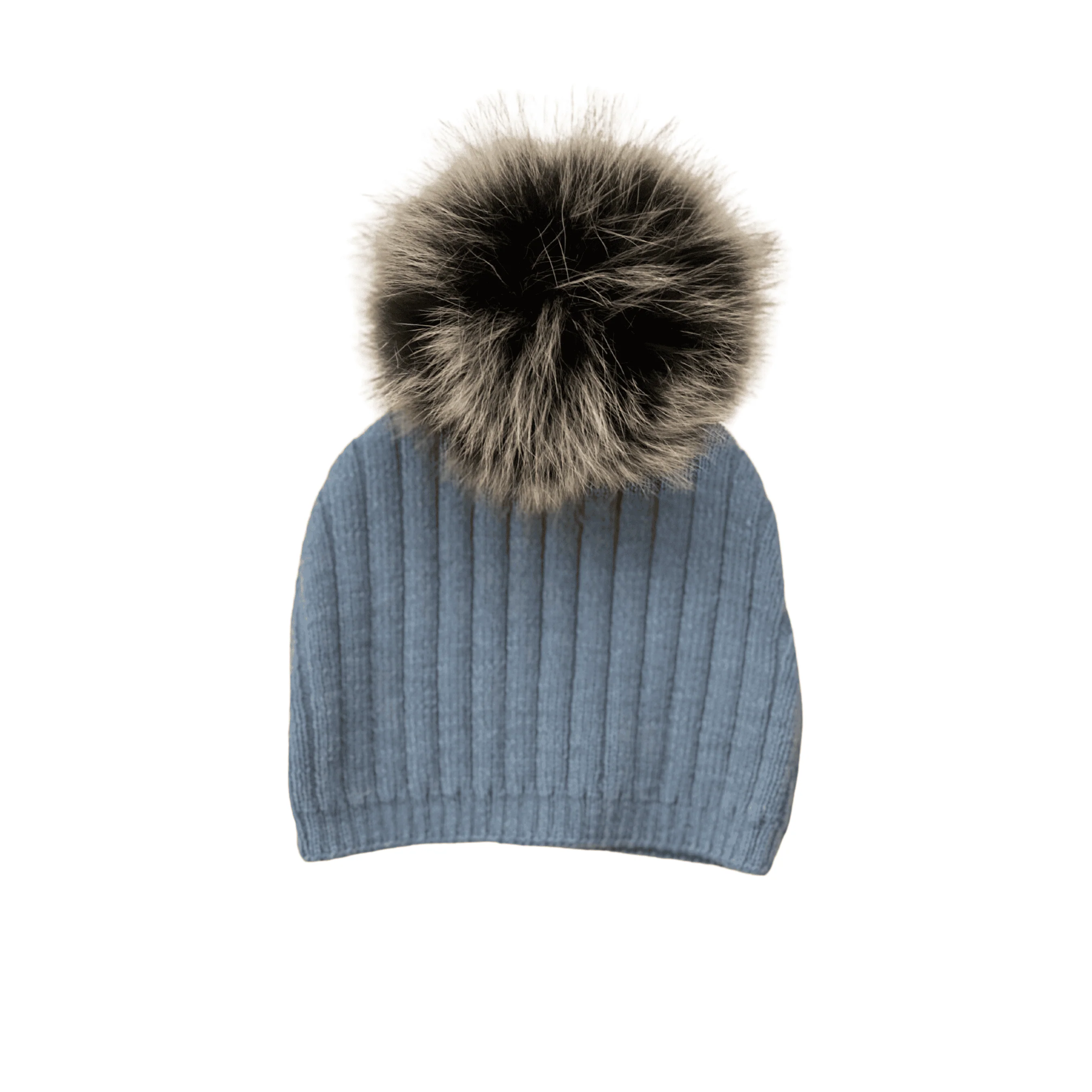 - Blue ribbed knit hat with removable pompom