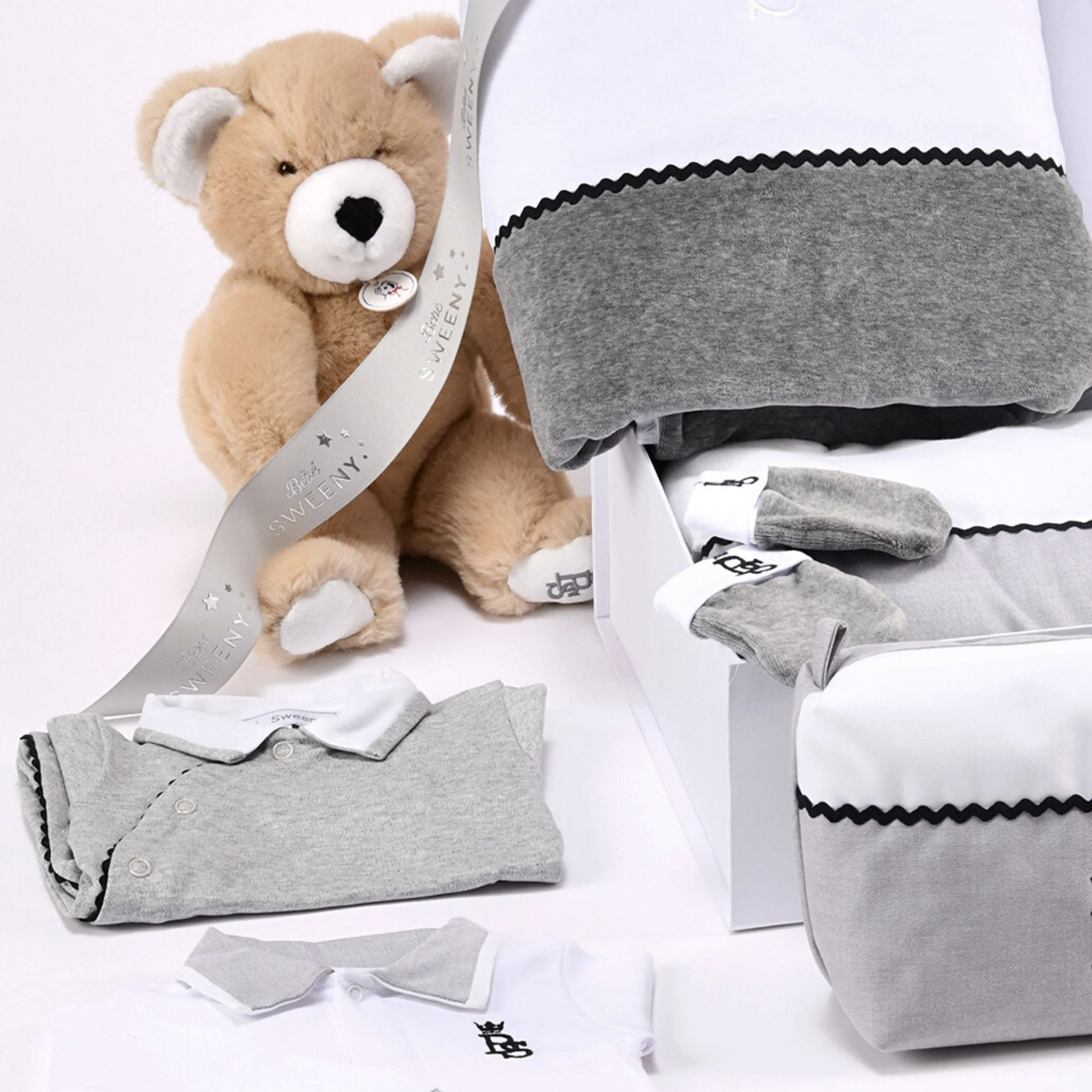 Smart babygrow for baby boys with a white & grey oxford fabric collar, made in soft and comfortable lightweight cotton, It has invisible front opening with a black piping on the front and a black embroidery on a foot.