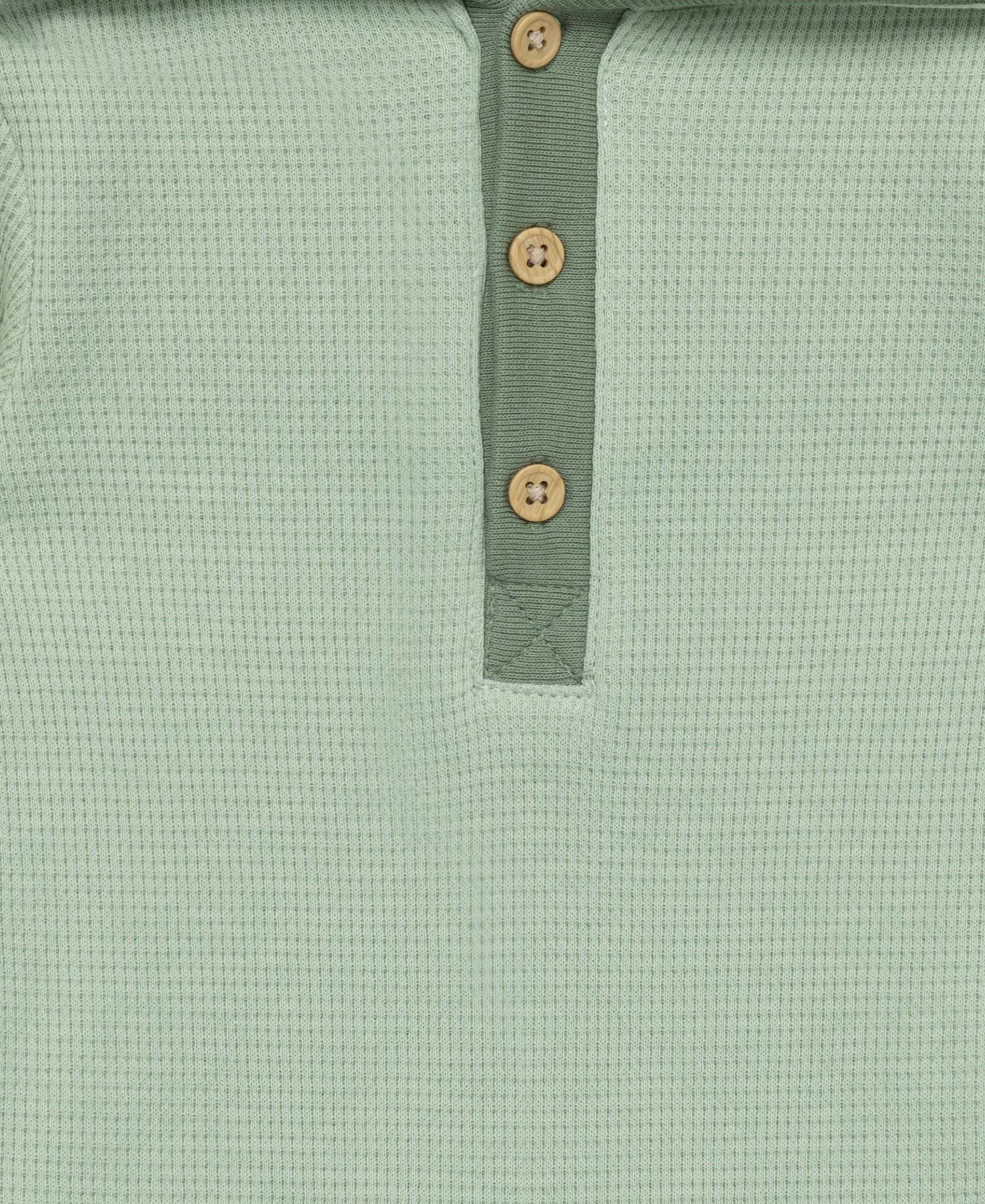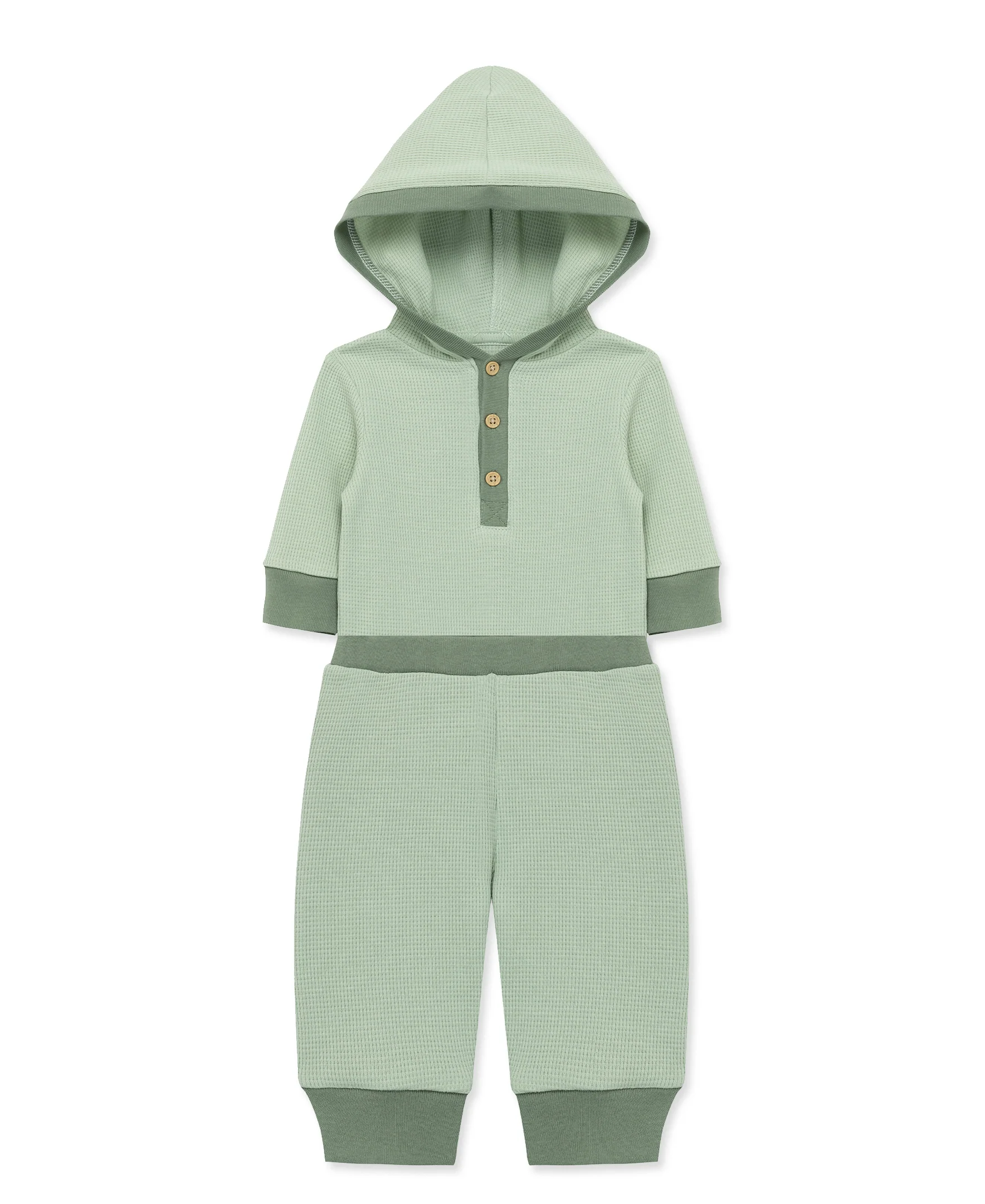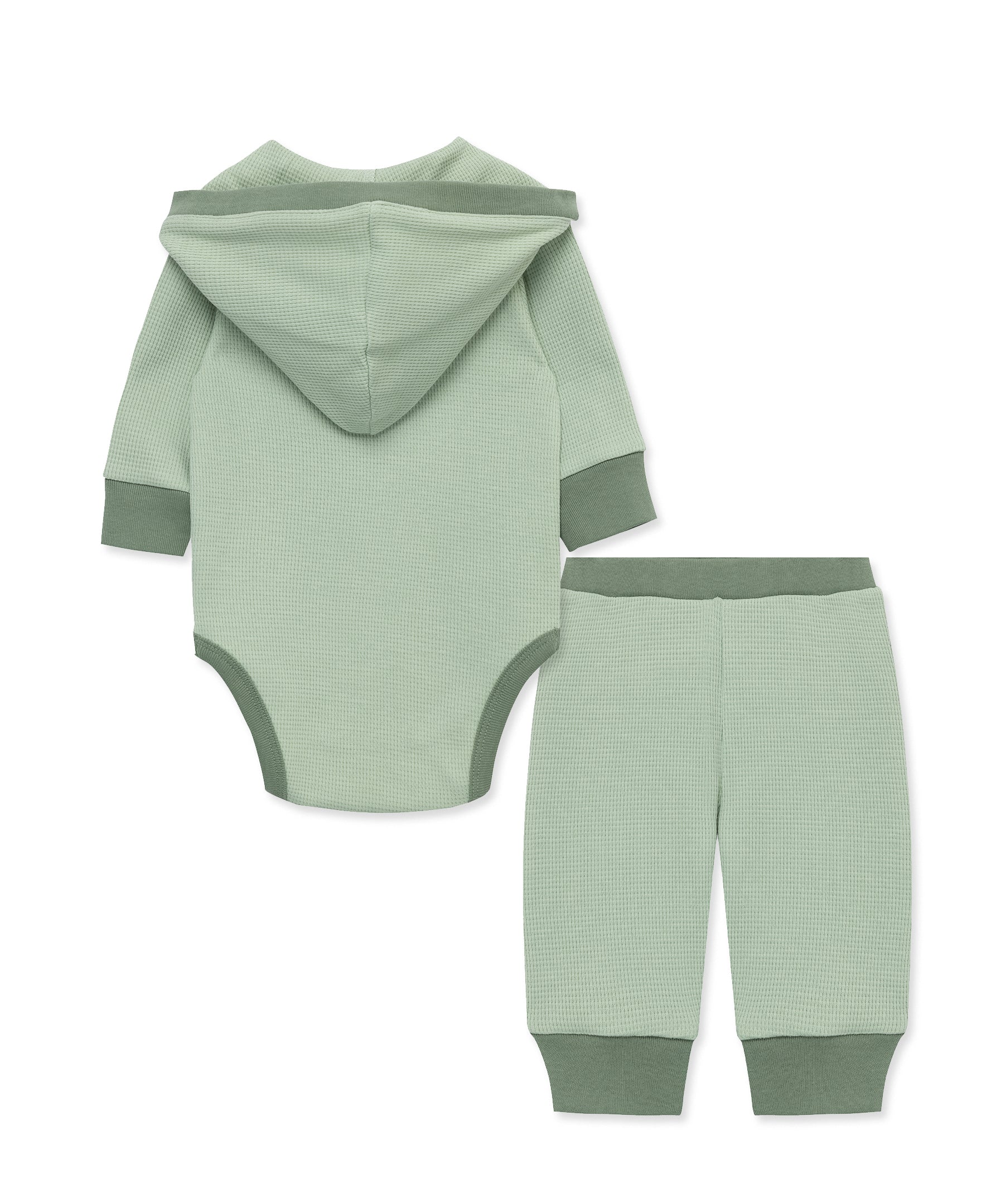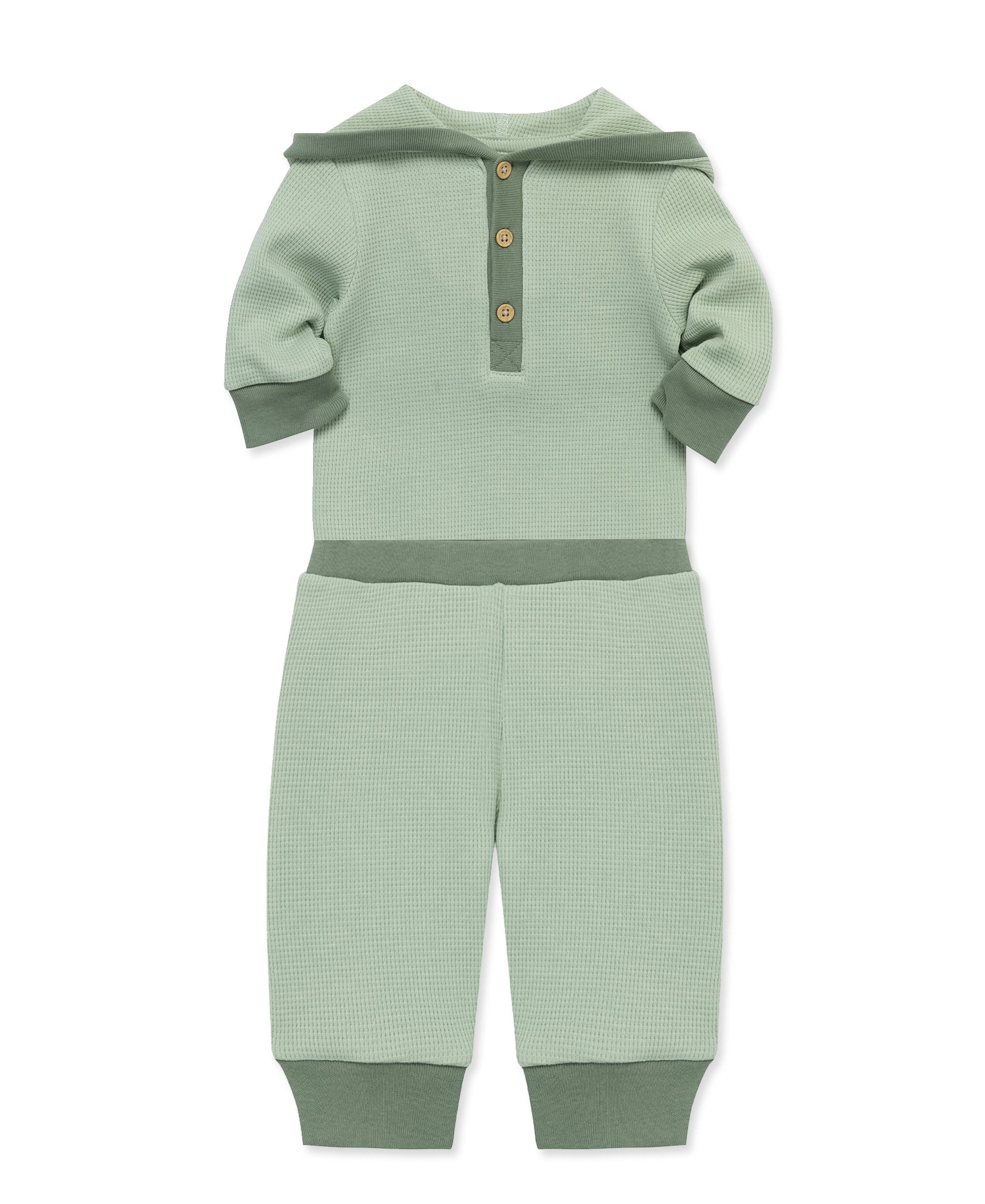 An essential in baby's closet, our green waffle knit hooded bodysuit and pant set is a cute necessity. Made with organic cotton fo extra coziness.