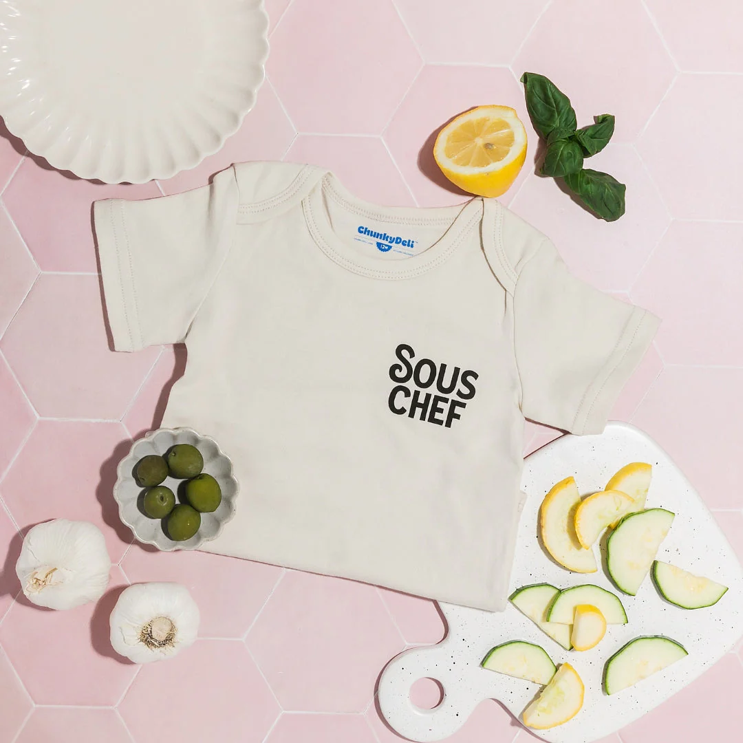 This modern infant bodysuit is perfect for budding future chefs, printed on supremely soft cotton. A classic gift that is sure to bring families together in the kitchen. Looking for more sizes & styles? Visit Chunky Deli's 'Made to Order' collection.