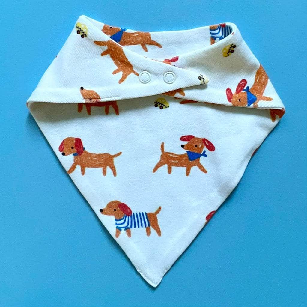 If you adore puppies like we do, you'll surely be a fan of this adorable baby onesie and kerchief bib with allover dog print. Featuring our very own 'Sparkie' the dog chasing our beloved taxi rattle and more, the one-piece and bib are soft, playful and fun, just like their furry inspiration. A wonderful baby gift for anyone who loves dogs.