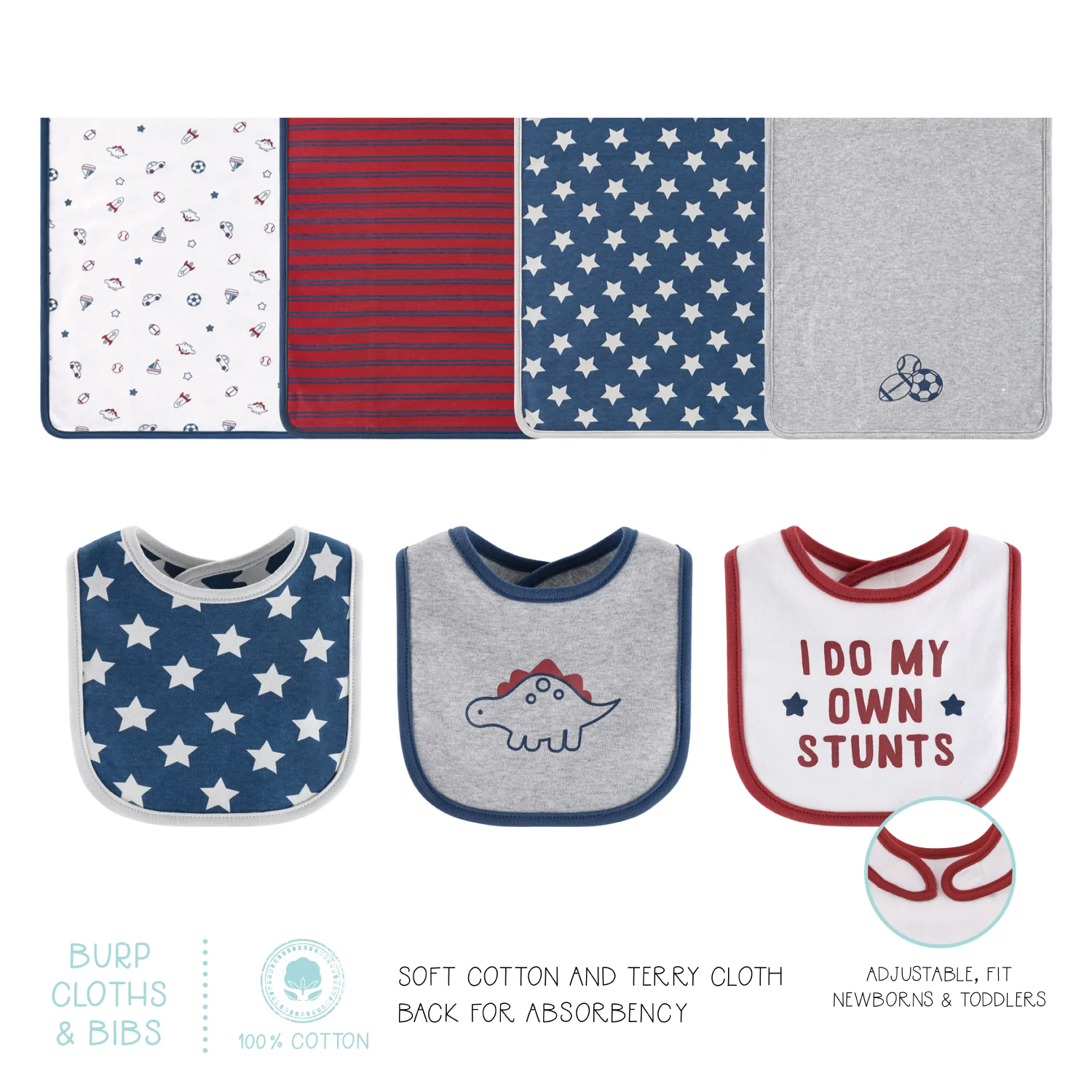 Revamp your baby boy's wardrobe with the Boy Stuff 30-piece layette set by The Peanutshell. This adorable collection is a treasure trove of fashion essentials, perfect for dressing your little adventurer from head to toe. Includes 2 long sleeved bodysuits, 3 short sleeved bodysuits, 4 pairs of pants, 4 hats, 4 pairs of scratch mittens, 4 pairs of socks, 4 burp cloths, 2 footed zip-up sleepers, and 3 terry feeding or drool bibs, this set offers a wide variety of options that will keep your little man looking stylish and feeling comfortable. Each piece is expertly crafted using soft and gentle fabrics, ensuring that baby's delicate skin remains cozy and irritation-free. With a red, white, heather gray and navy blue colorway, these primary brights are both classic and timeless. Each print evokes boyish charm from the navy and gray star, to the icon toss featuring dinosaurs, cars, stars, and baseballs. A simple red and navy stripe rounds out the assortment. Mix and match to create endless adorable outfits, and keep your baby looking cute throughout the day!