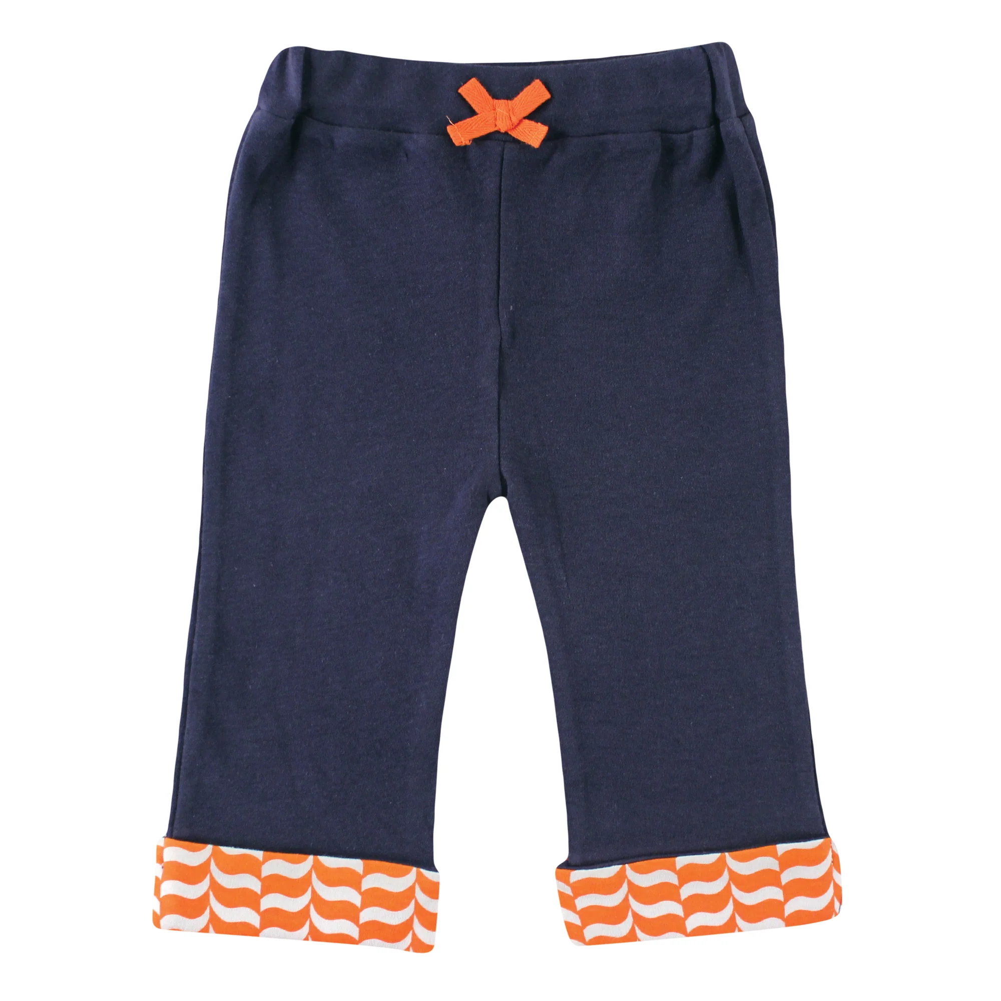 - Navy pant features a contrasting orange drawstring bow accent and orange pattern cuffs that match the jacket collar