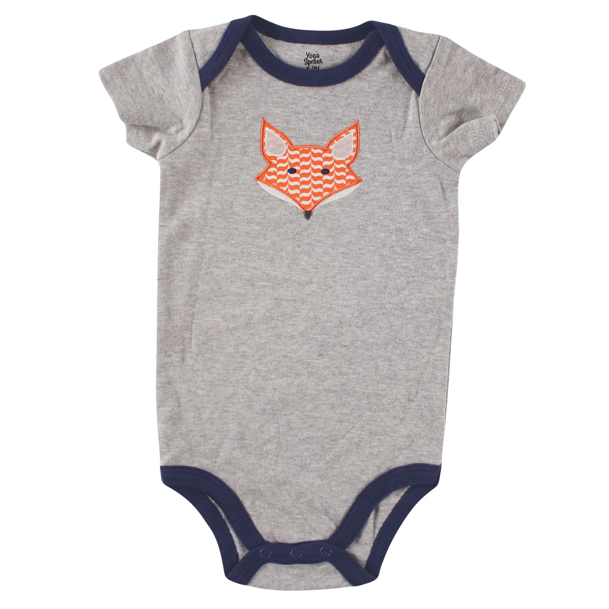 - Grey heather bodysuit features fox applique accent, navy trim, and snap bottom for easy changes