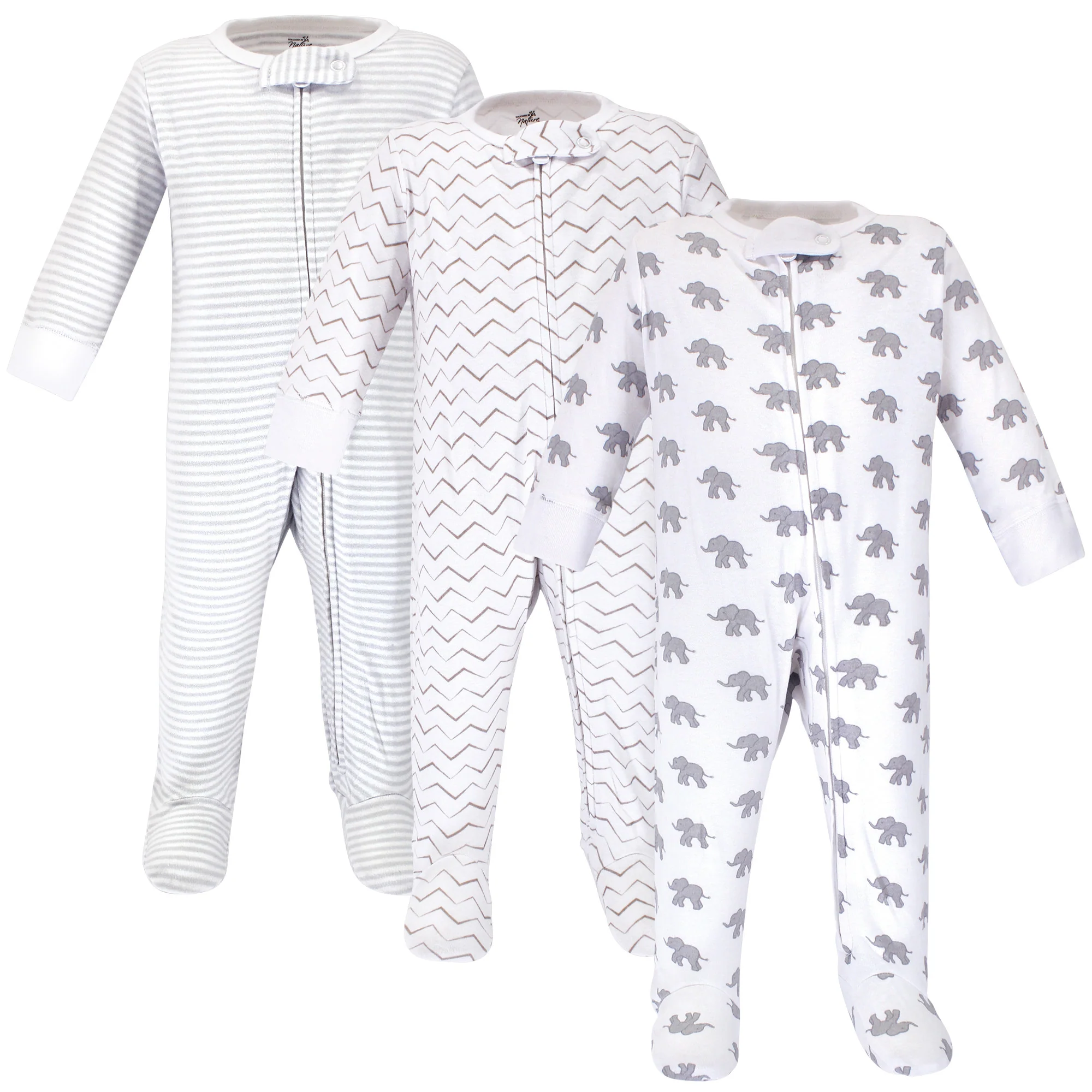 Touched by Nature Baby Organic Cotton Zipper Sleep and Play 3 Pack, Marching Elephant