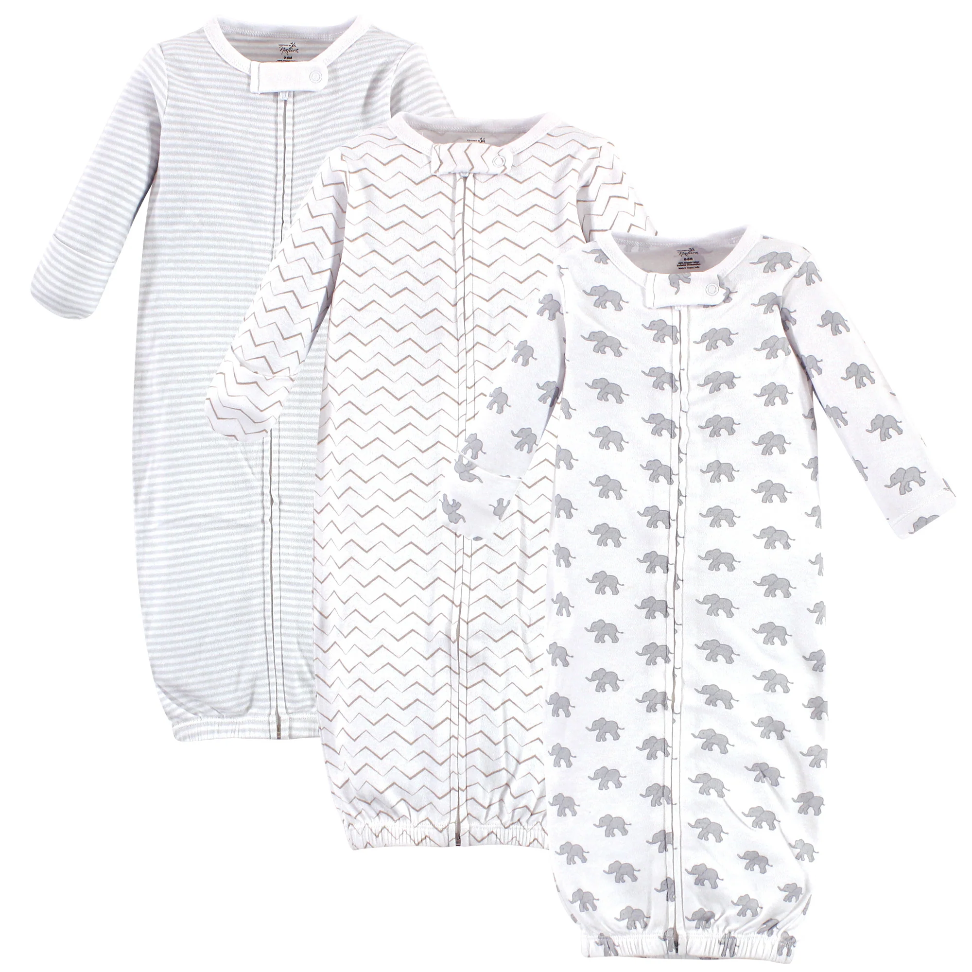 Touched by Nature Organic Cotton Zipper Long-Sleeve Gowns 3 Pack, Marching Elephant