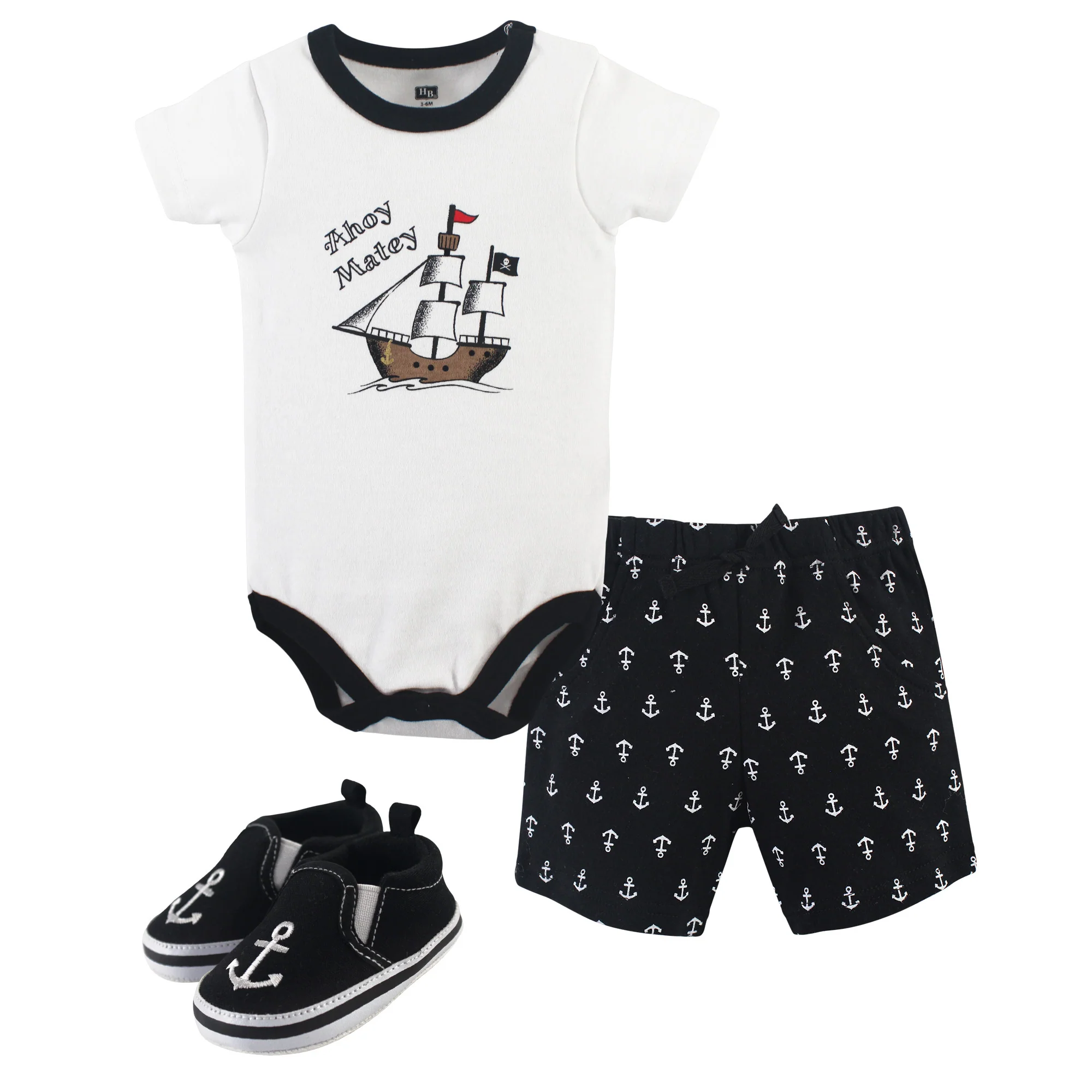 Hudson Baby Infant Boy Cotton Bodysuit, Shorts and Shoe 3 Piece Set, Pirate