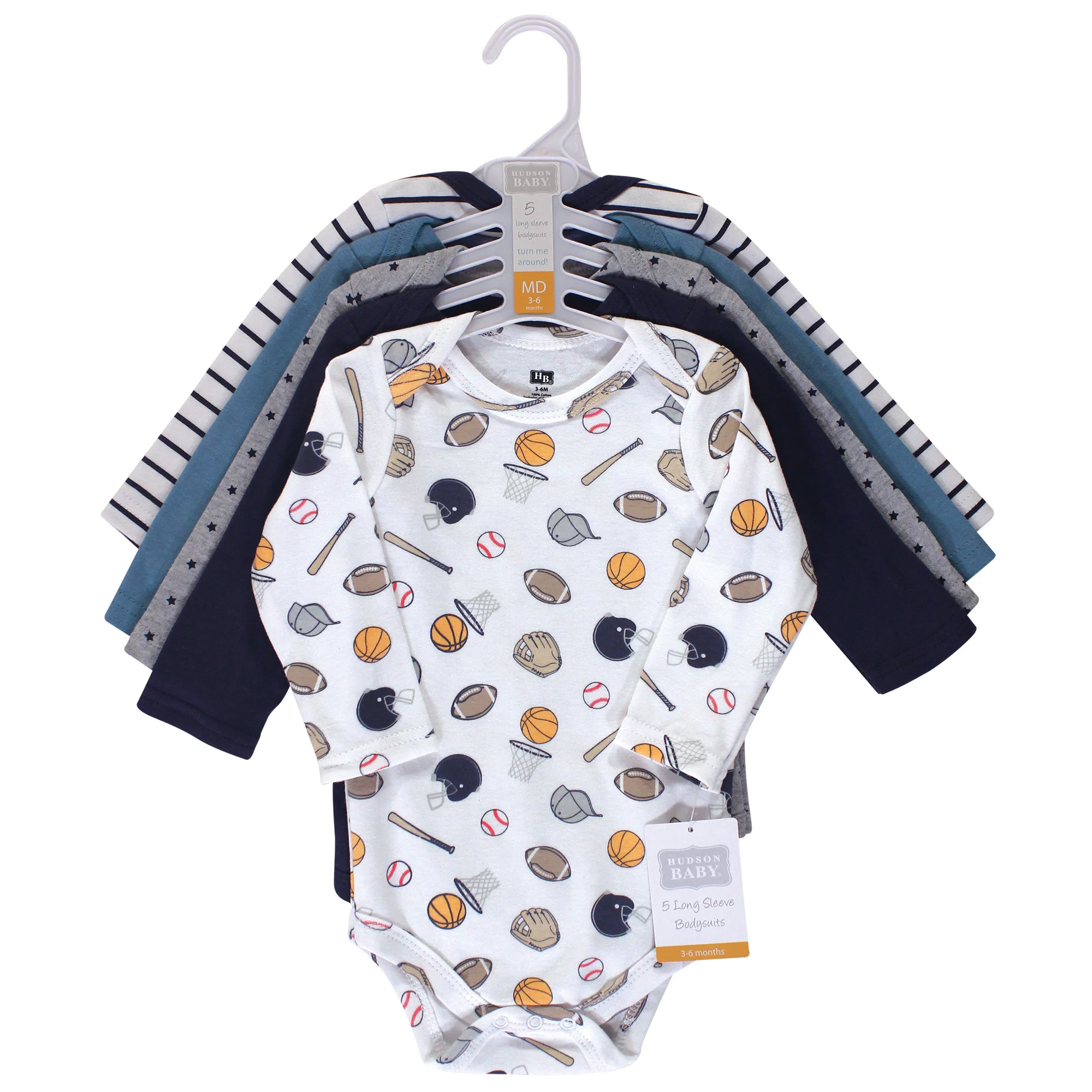 Hudson Baby Infant Boy Cotton Long-Sleeve Bodysuits 5 Pack, Basic Sports