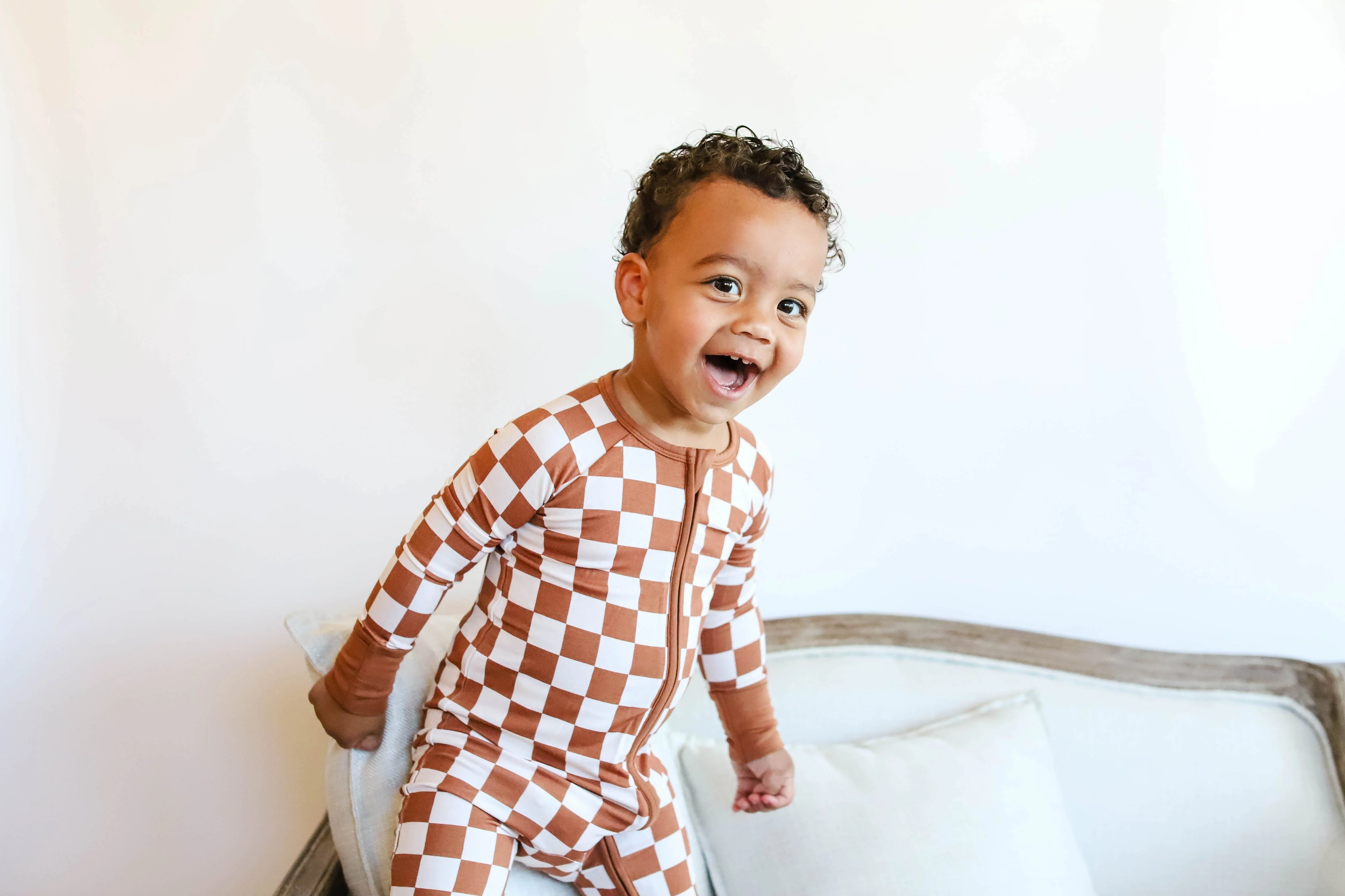 forever french baby Bamboo Zip Pajamas | Faded Brown Checkerboard