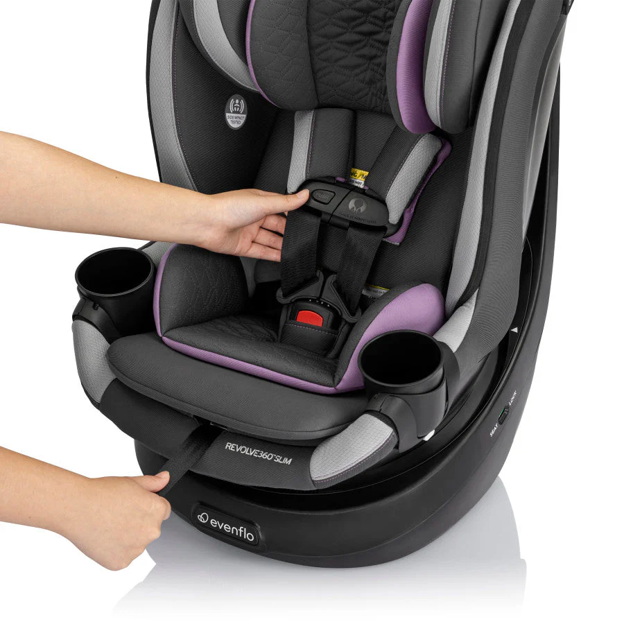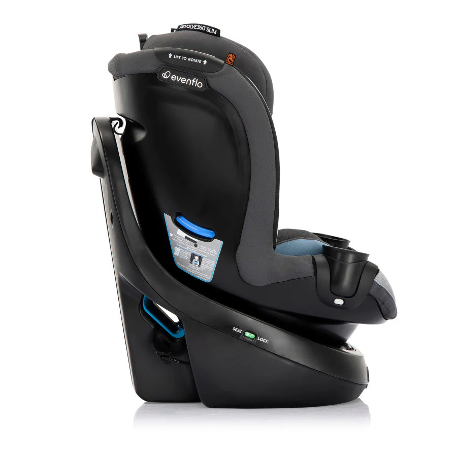 Got a compact vehicle and a little one on the way? Check out the Evenflo® Revolve360™ Slim 2-in-1 Rotational Car Seat with Quick Clean Cover! We slimmed the exterior of our revolutionary car seat to create a 16.7” footprint without sacrificing your child’s seating space or safety. You can fit more of what you love into your backseat with more room for passengers and your growing family! A spin-off of the Revolve360, America’s bestselling rotational car seat, the Revolve360 Slim offers one-hand, 360° rotation in all modes, making it easier to get your child in and out of the car. But a 360° rotating car seat is just the beginning. The Revolve360 Slim offers two modes: rear-facing (4 lb to 50 lb, for a child measuring from 17 in. to 48 in) and forward-facing (22 lb to 65 lb, for a child measuring 28 in. to 49 in.). For peace of mind all the way around, this slim fit car seat offers the extended security of rear-facing all the way up to 50 lb. Child safety experts say the longer your child remains rear-facing, the better. Convenience comes full circle in a rotating car seat you can install just once for rear-facing and forward-facing — no need to uninstall your car seat in order to make the switch. Sure360™ Safety Installation System with LockStrong™ and Tether360™, plus a handy bead-level indicator for leveling in seconds, make one-time installation safe, secure and simple. The best swivel car seat is one that’s easy to keep clean! To keep your Revolve360 Slim car seat looking fresh over years of snacks, spills and all the adventures to come, a handy Quick Clean Cover is included — it’s easy to remove, easy to wash, easy to live with. On-the-go recline means you can adjust the car seat to the perfect angle without having to reinstall the car seat or bother your child. Offering style and ease at every turn, the Revolve360 Slim features premium fabrics and elevated touches to complement your bold moves in style. Discover the new spin on Slim!